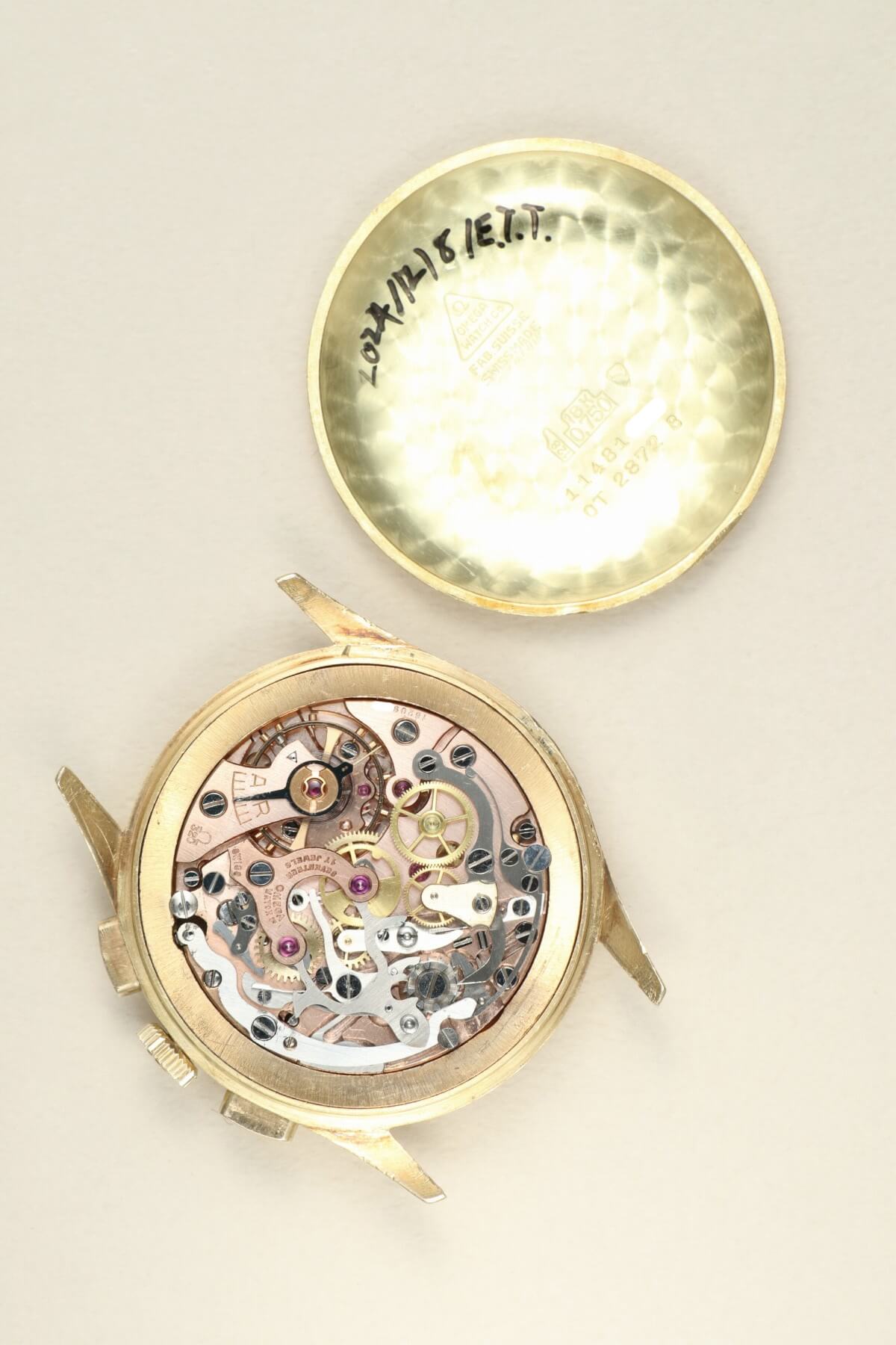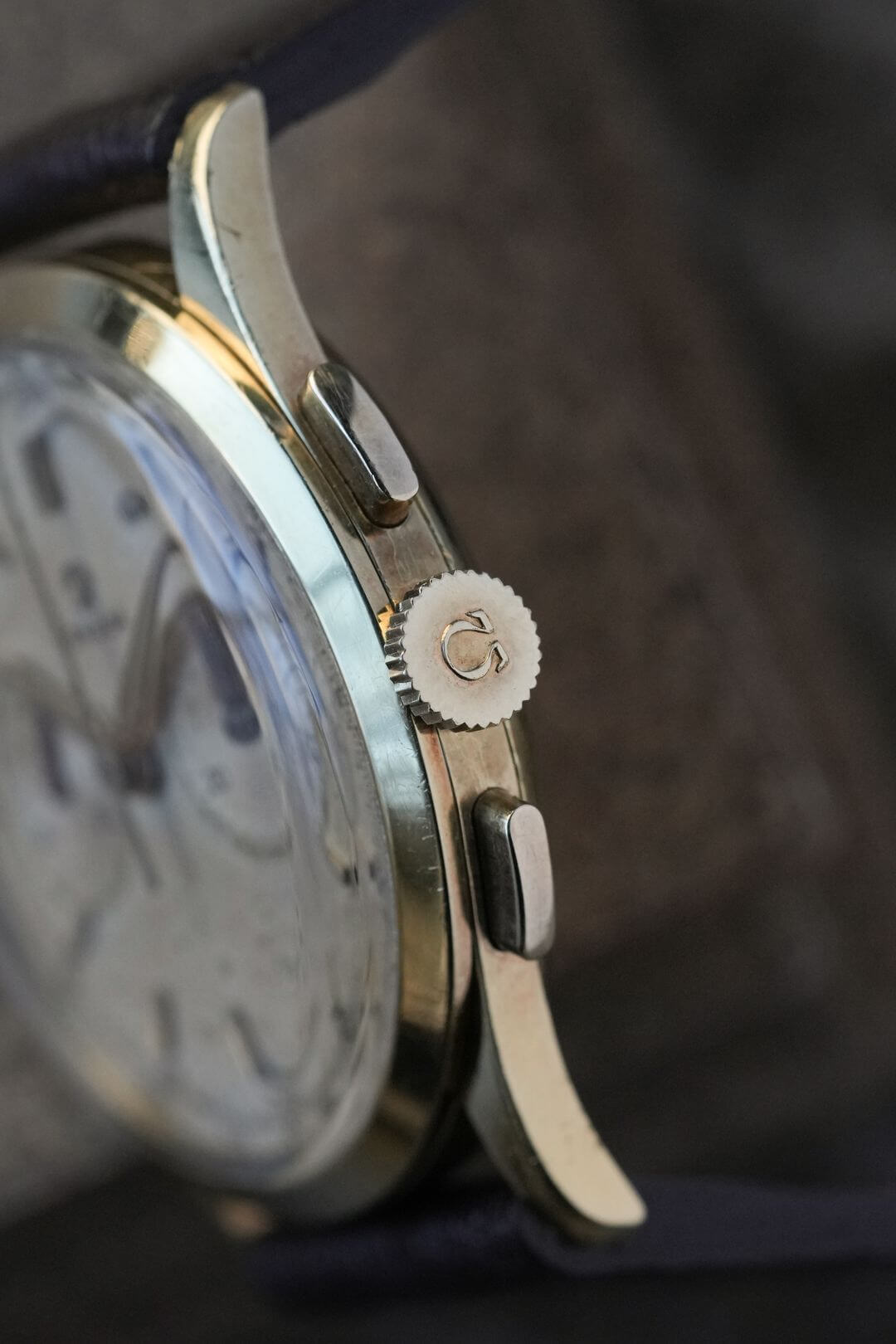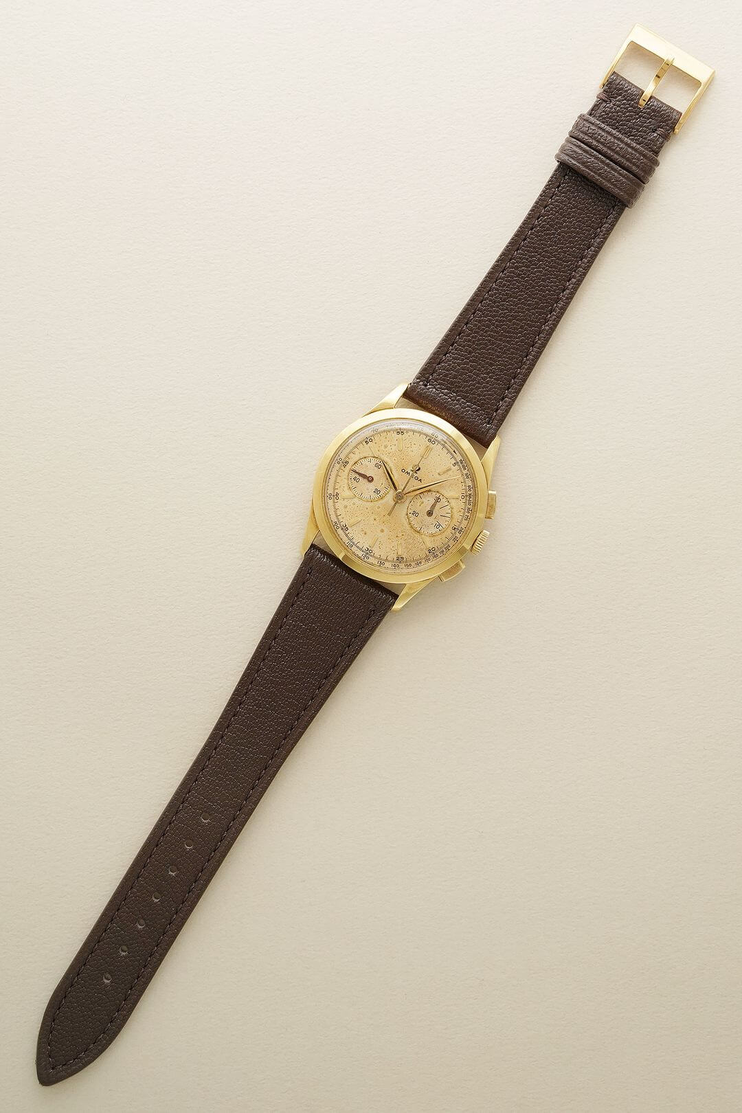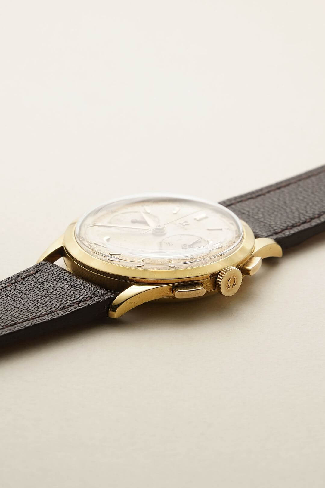 今回は、そんな歴史的なモデルの誕生以前に展開された希少なモデル、Ref.OT2872-8をご紹介します。ヴィンテージ時計ならではの趣を備えた、クロノグラフでは珍しいイエローゴールドケースの貴重なディテール。褐色に経年変化したアイボリーダイヤルに、立体感を際立たせるクサビインデックス、美しいアルファハンドなど、現代の時計では味わえない魅力を堪能できる逸品です。