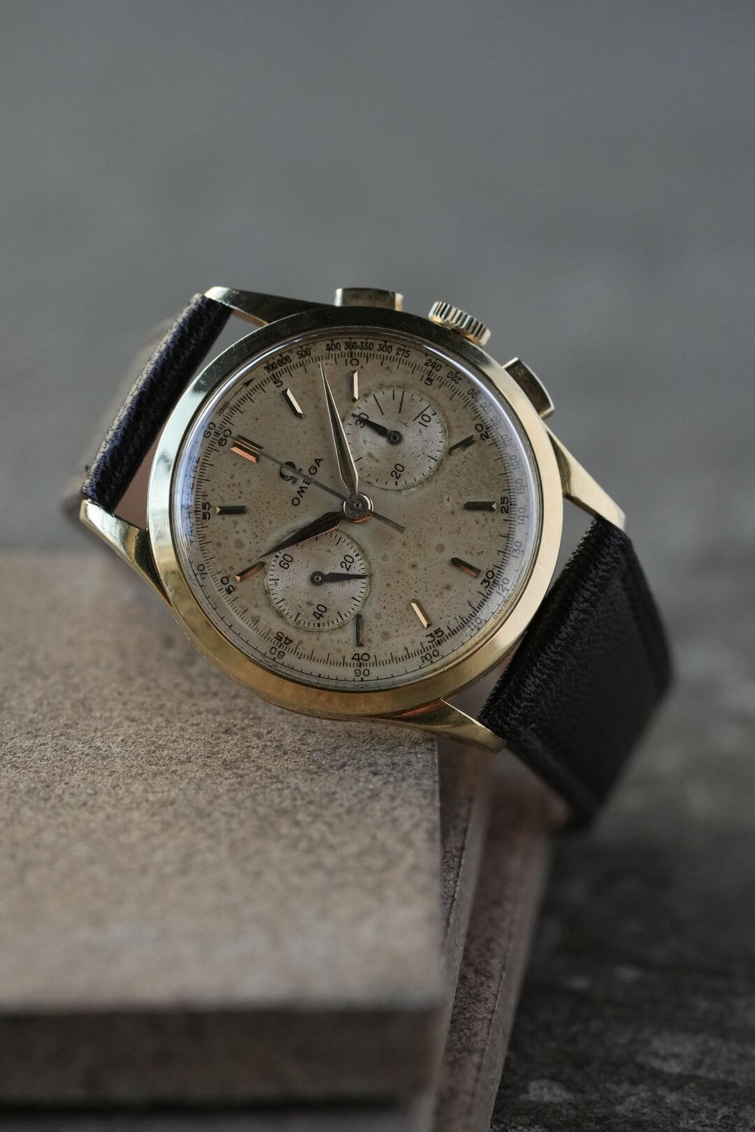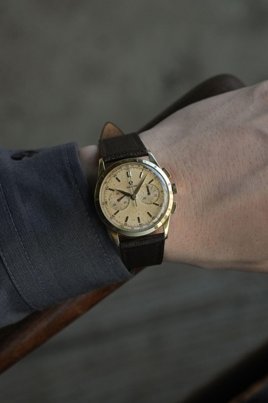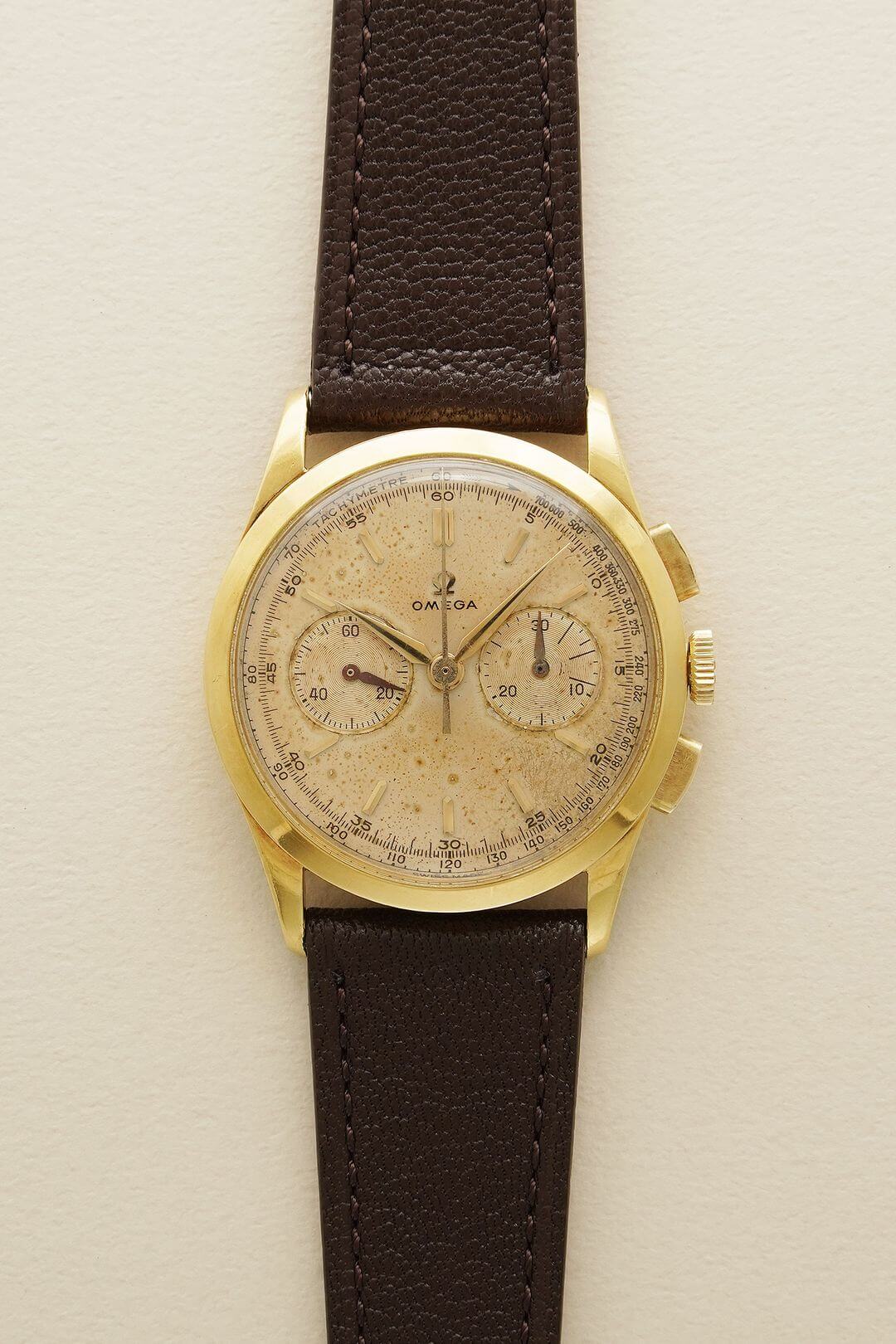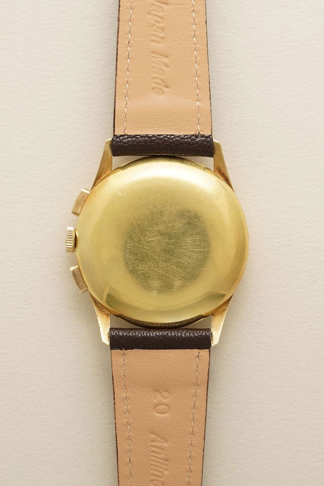 今回は、そんな歴史的なモデルの誕生以前に展開された希少なモデル、Ref.OT2872-8をご紹介します。ヴィンテージ時計ならではの趣を備えた、クロノグラフでは珍しいイエローゴールドケースの貴重なディテール。褐色に経年変化したアイボリーダイヤルに、立体感を際立たせるクサビインデックス、美しいアルファハンドなど、現代の時計では味わえない魅力を堪能できる逸品です。