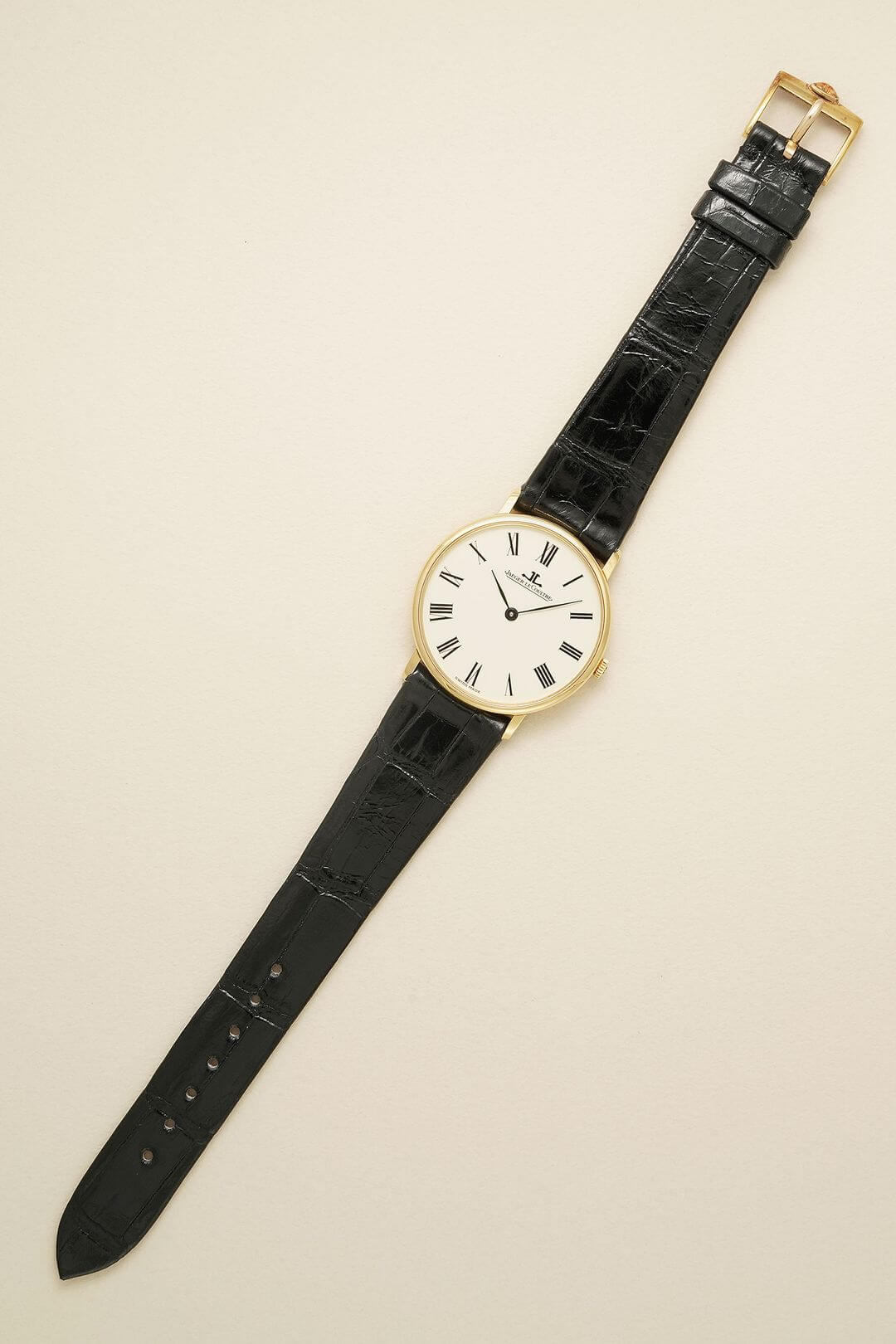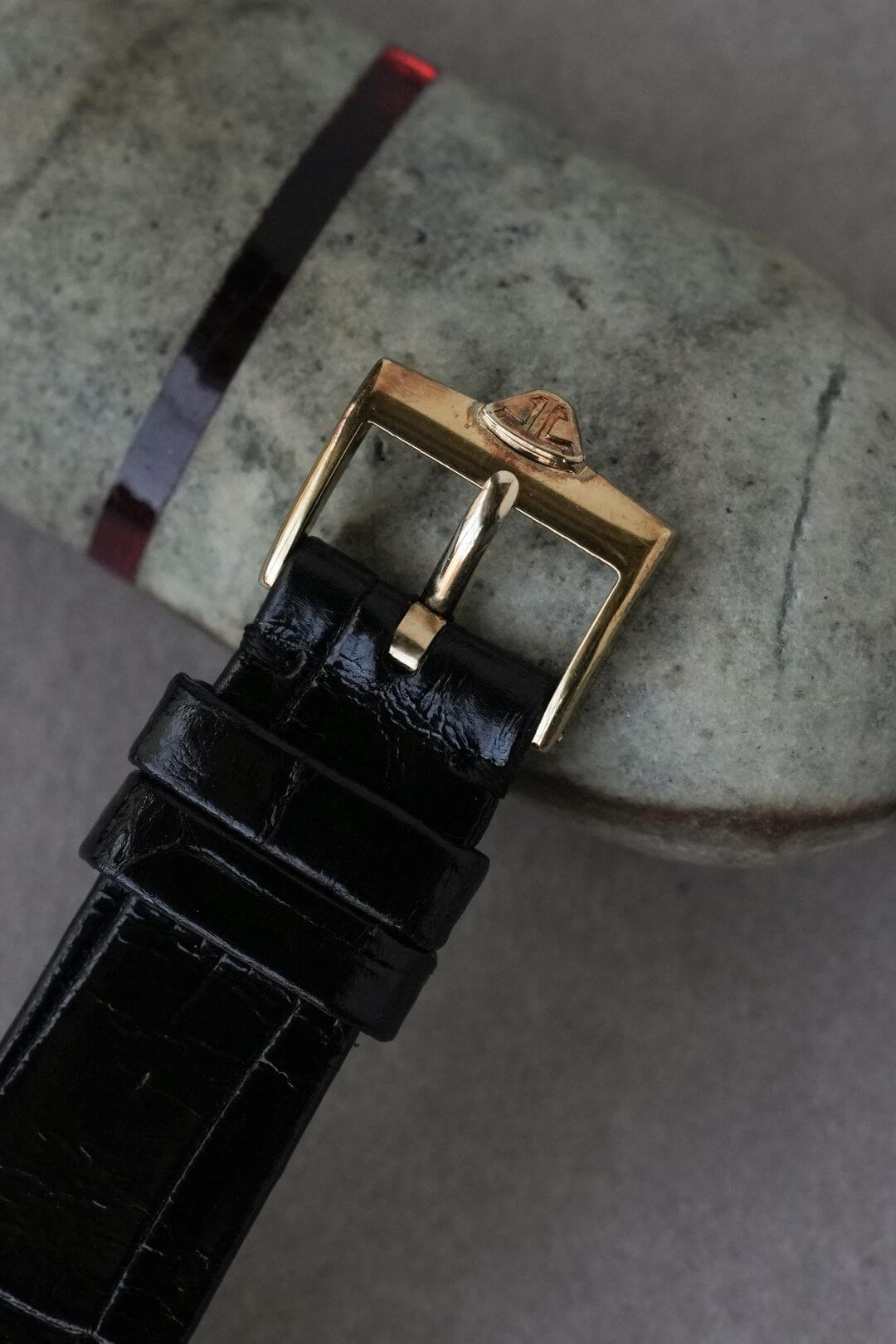 レザーブレスには、当店オリジナルのクロコダイルレザーのシャイニーブラックをセッティング。キャップゴールド製のジャガールクルト純正尾錠が付属しております。