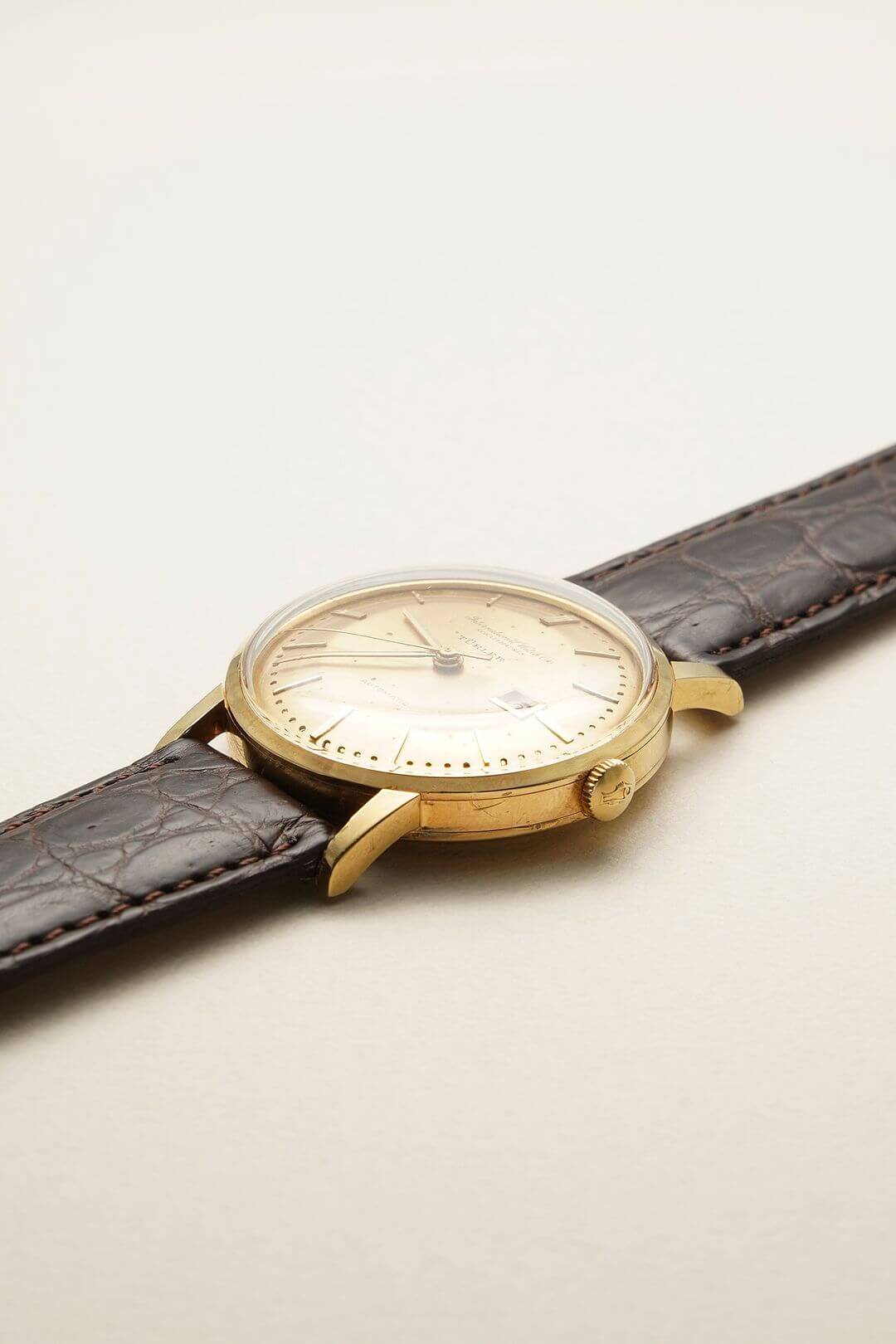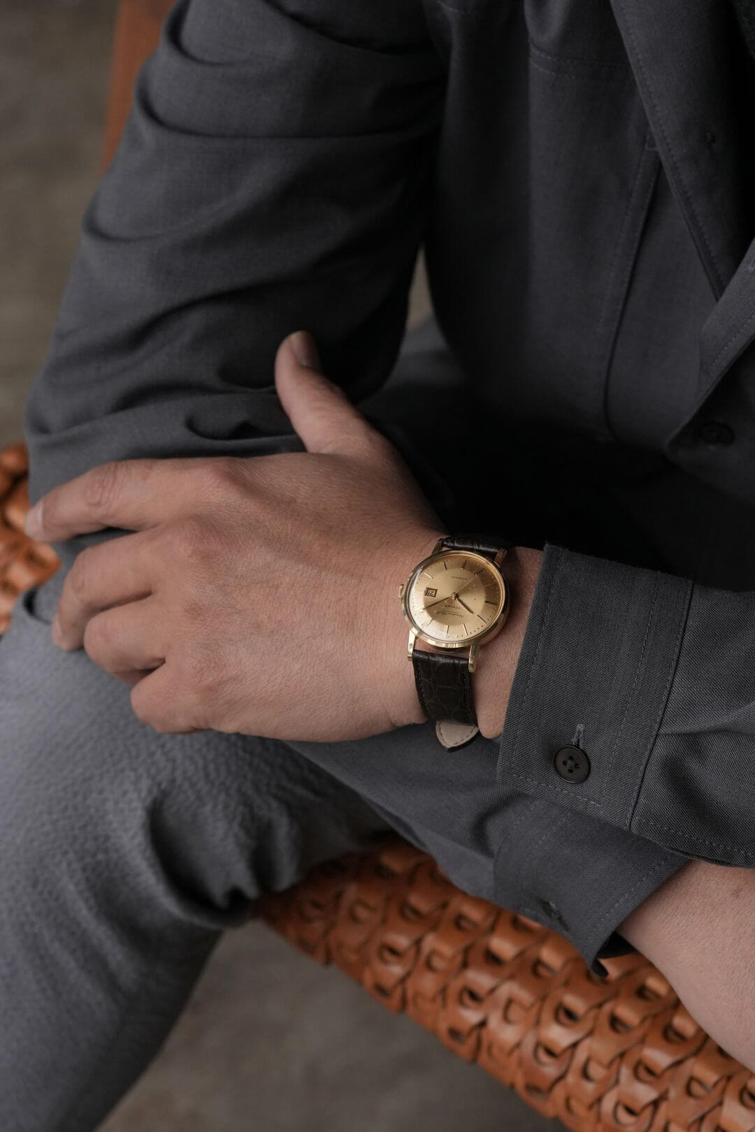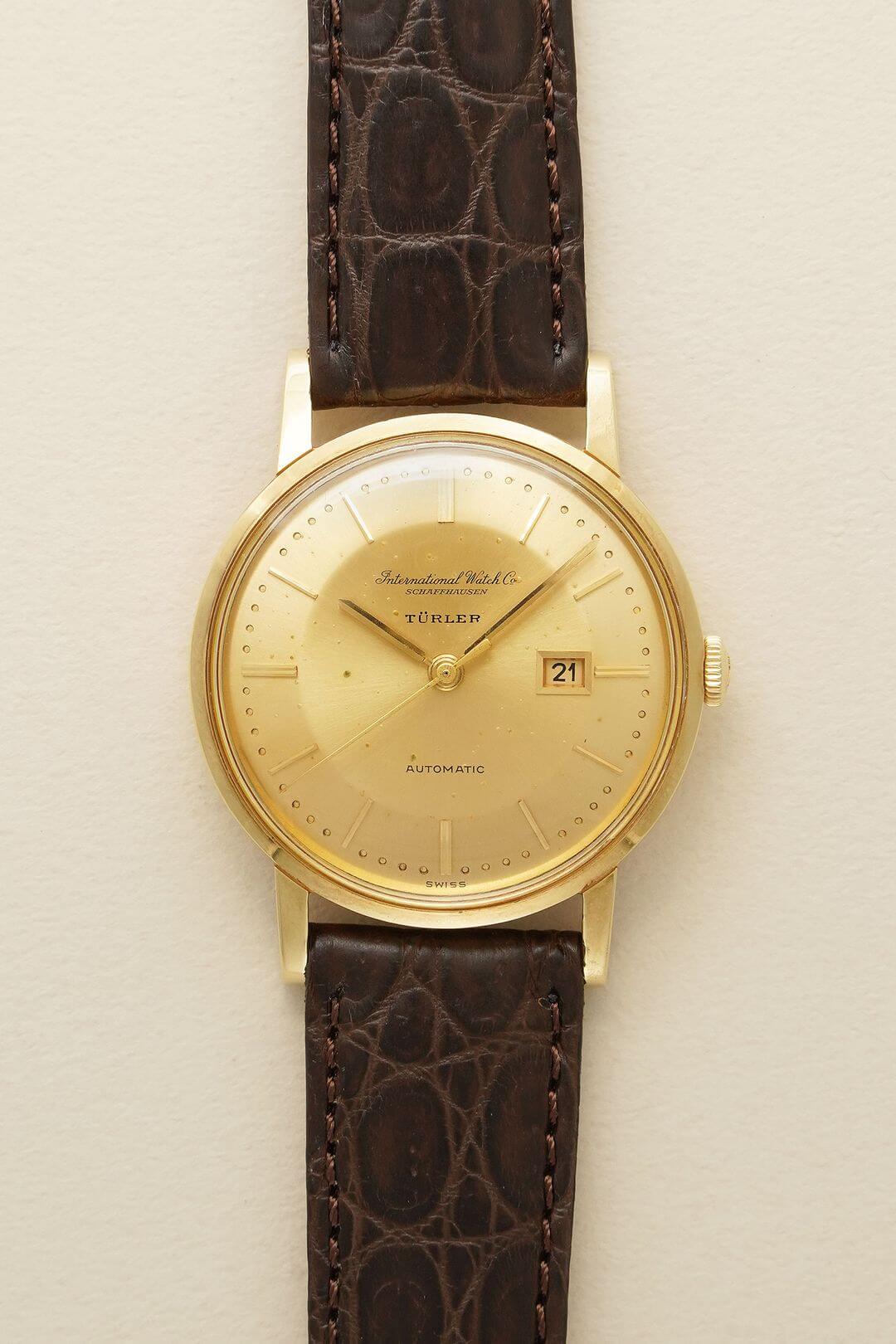 今回は、シンプルでありながらも、風格ある重厚感をご堪能いただけるモデルのご紹介です。端正な顔つきのイエローゴールド製のラウンドケースに、綺麗なサンバースト仕上げが施されたゴールドダイヤルで、あらゆるシーンで活躍してくれるデザイン。70年代以前の証である筆記体ロゴのみの表記、ミニッツマーカーに金属のボールを埋め込む[Pearl Drop/パール・ドロップ手法]や、アイコニックな魚リューズも健在し、質実剛健でありながらも高級感をも漂わせています。