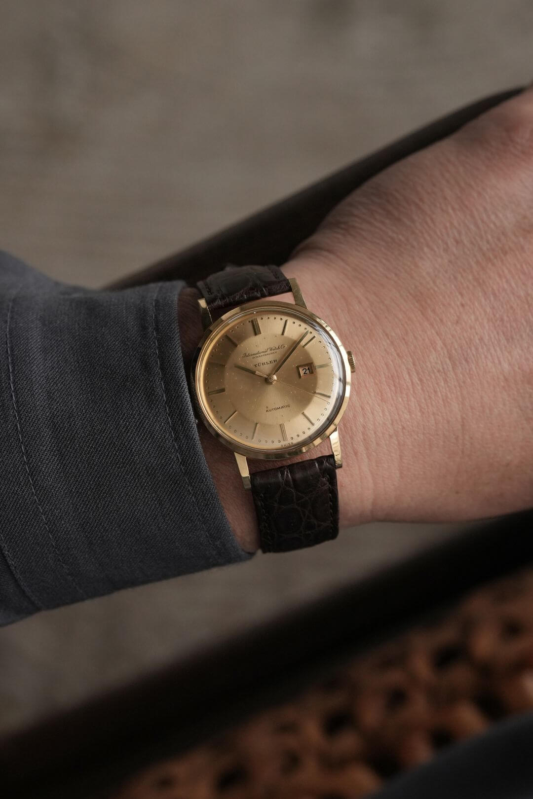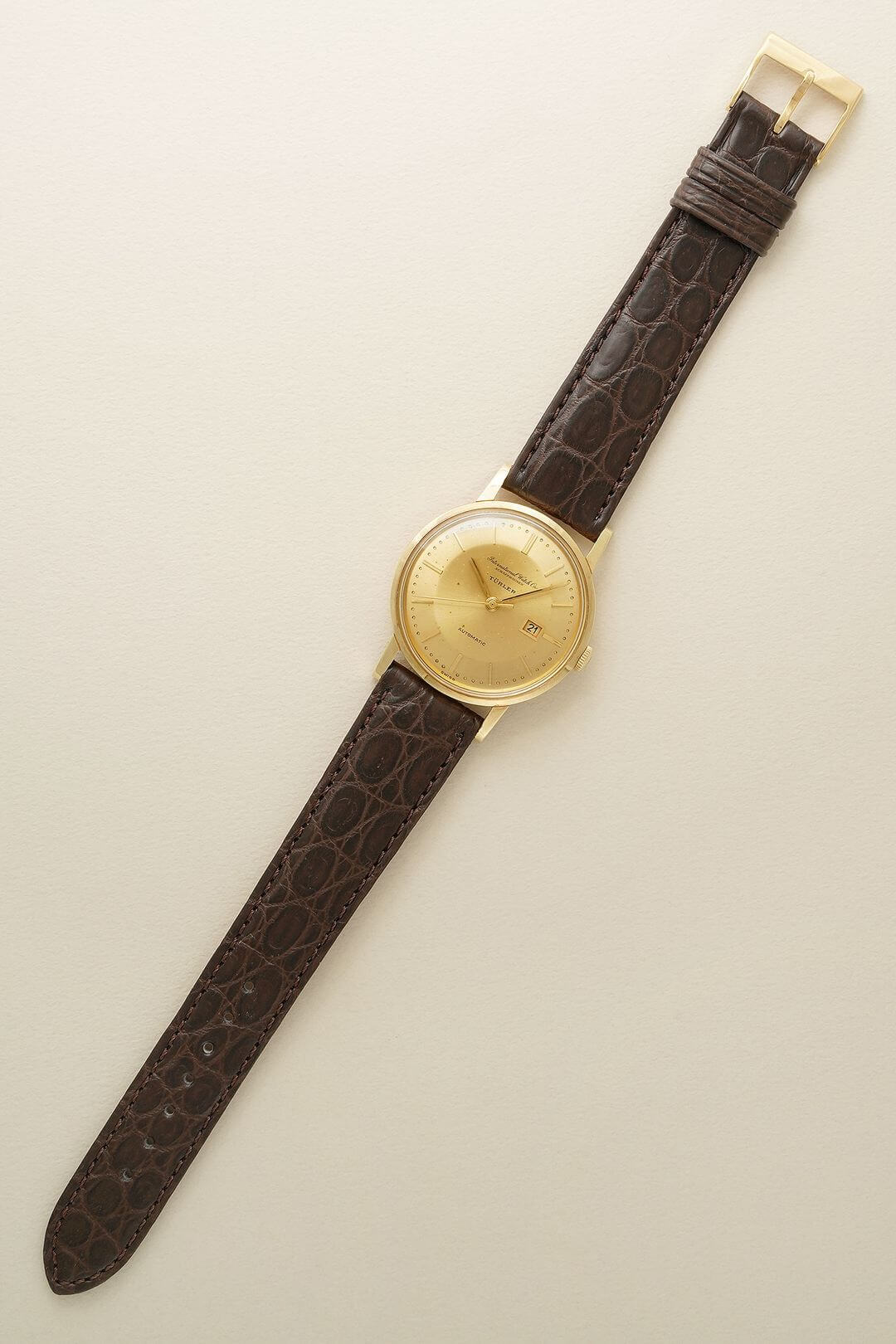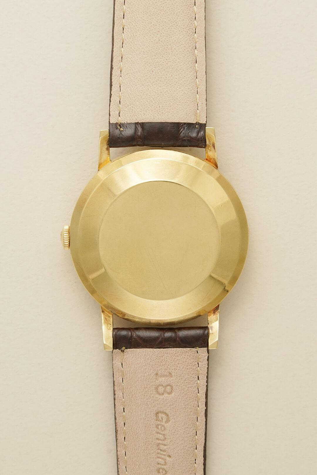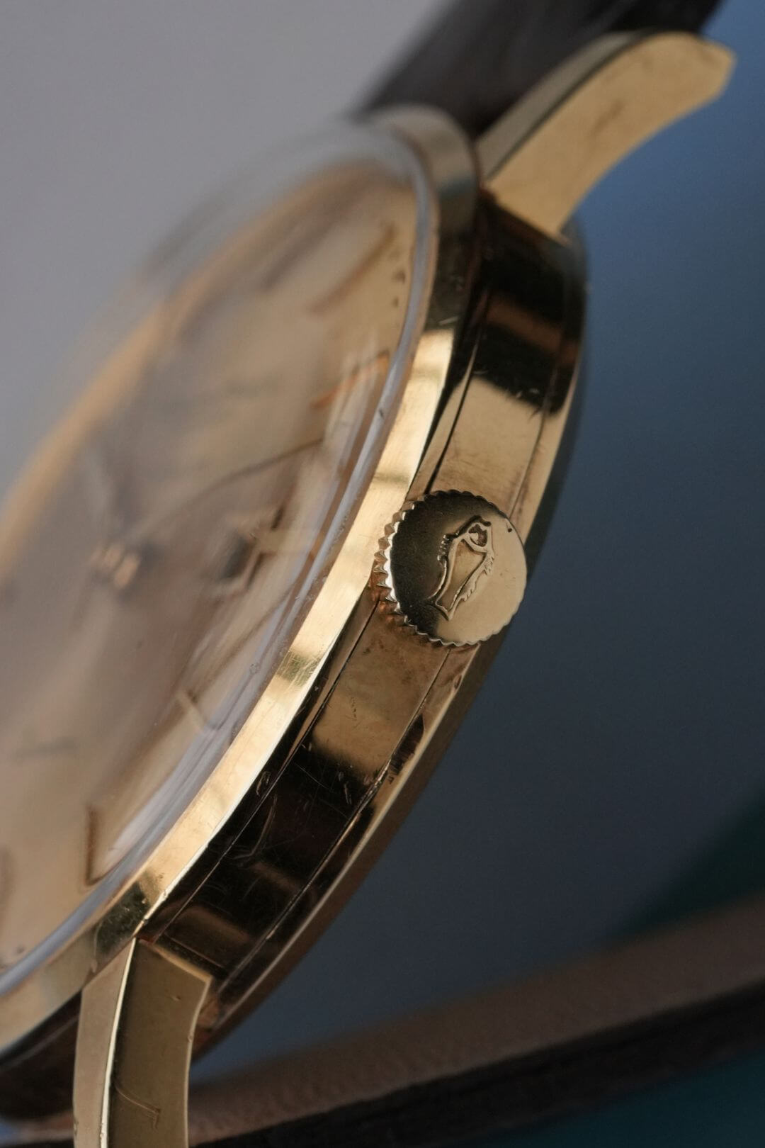 今回は、シンプルでありながらも、風格ある重厚感をご堪能いただけるモデルのご紹介です。端正な顔つきのイエローゴールド製のラウンドケースに、綺麗なサンバースト仕上げが施されたゴールドダイヤルで、あらゆるシーンで活躍してくれるデザイン。70年代以前の証である筆記体ロゴのみの表記、ミニッツマーカーに金属のボールを埋め込む[Pearl Drop/パール・ドロップ手法]や、アイコニックな魚リューズも健在し、質実剛健でありながらも高級感をも漂わせています。