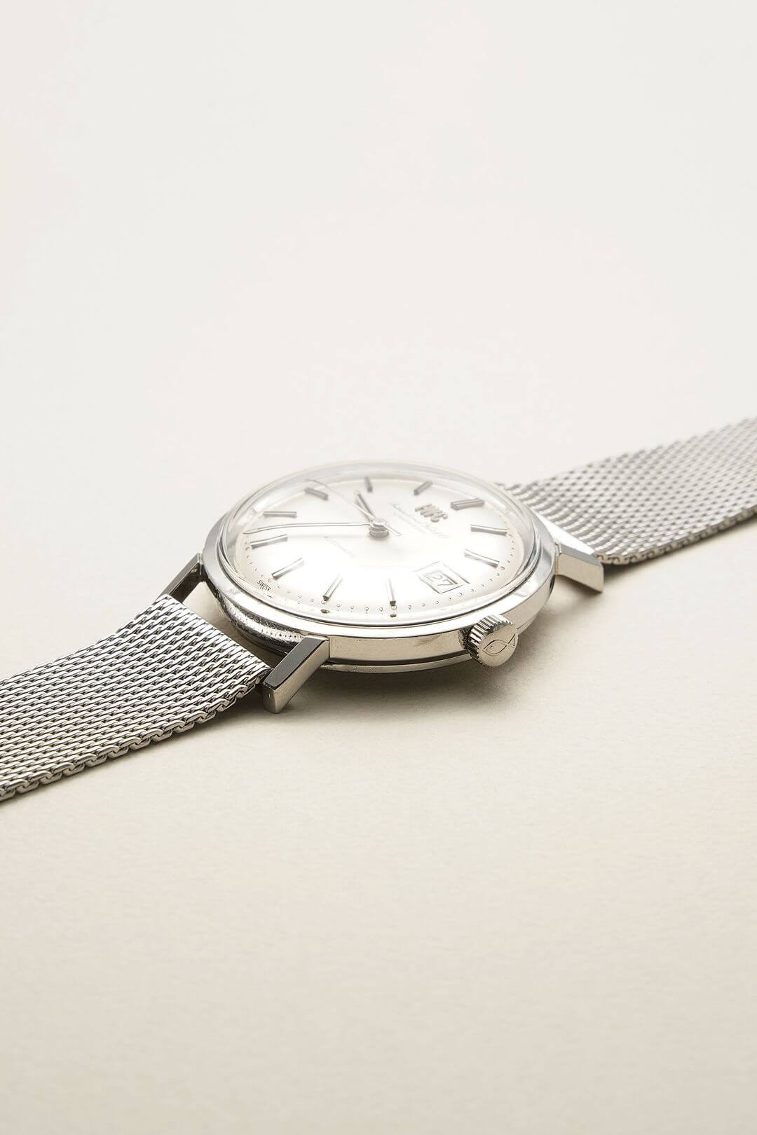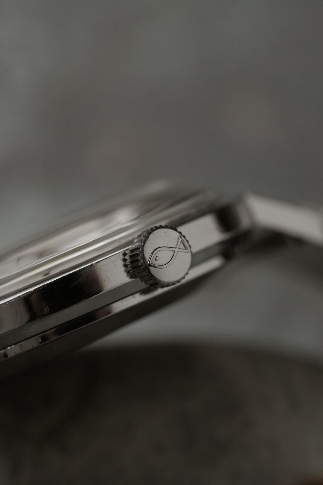 今回は、オールドインターらしい凛とした表情を持つモデル、Ref. R810ADのご紹介です。均整の取れたステンレスケースに、ヘアライン仕上げが美しいシルバーダイヤルが組み合わされ、清潔感と端正さを兼ね備えたデザインに仕上がっています。[IWC]のロゴが刻まれたダブルネーム表記や、アイコニックな魚マーク入りのリューズなど、当時の仕様を残しており、美観と実用性を高いレベルで両立しています。