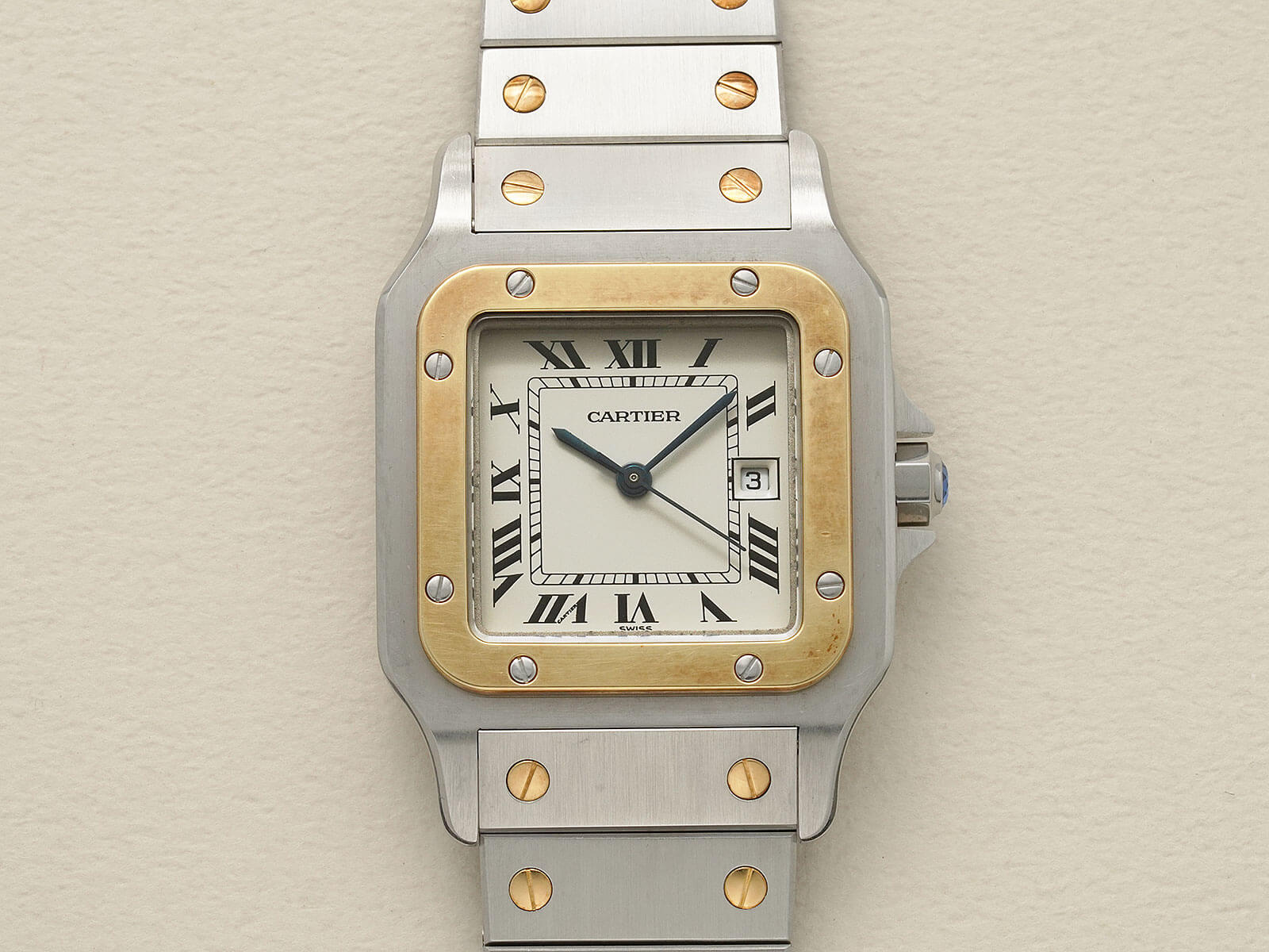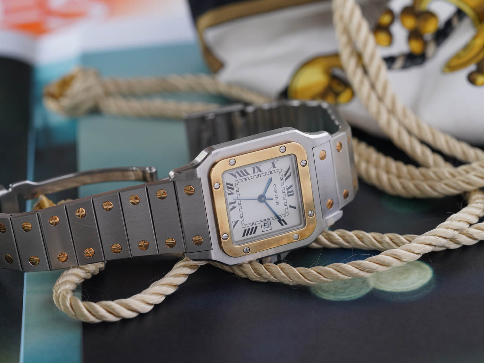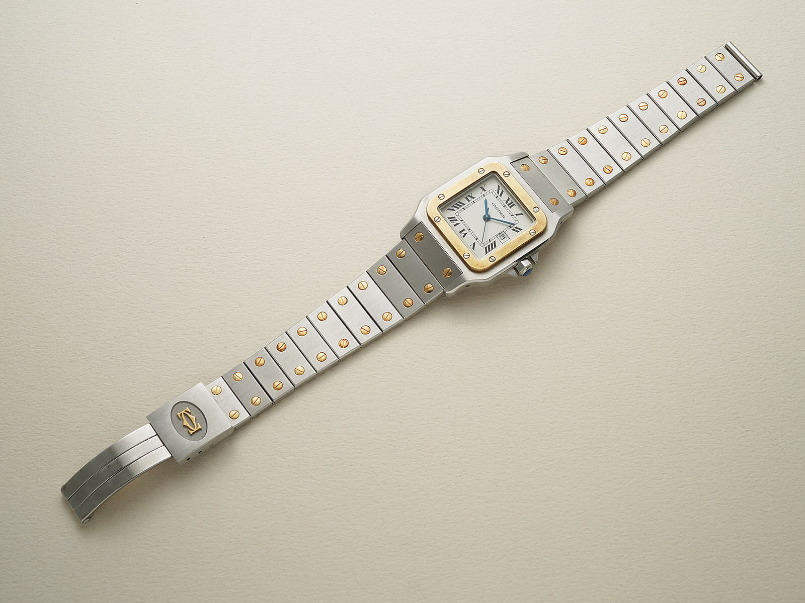今回は、カルティエらしく品の良いテイストに、スポーティなデザインを融合させたモデルRef.2961のご紹介です。初代サントスデュモンを受け継いだ、飛行機の機体にあるビスモチーフのベゼルに、伝統のホワイトローマンダイヤルにサファイアカボションリューズと、ラブブレスのコンビカラーの美しさが際立つデザイン。ステンレスを使用したサントスは過去にも製造された事が無く、独特な感性で造り出された、近代的なラグジュアリースポーツの魅力を感じさせるモデルです。