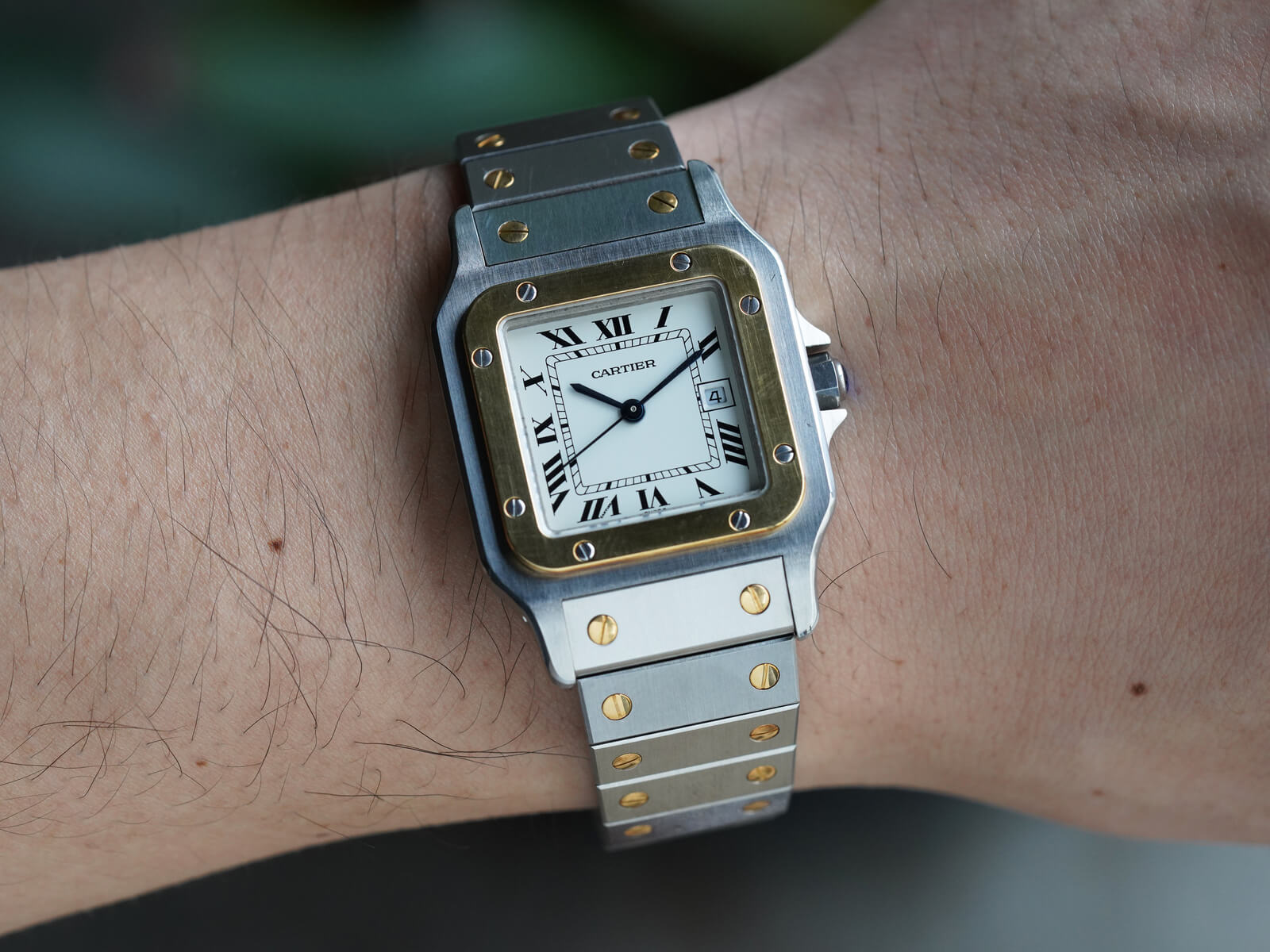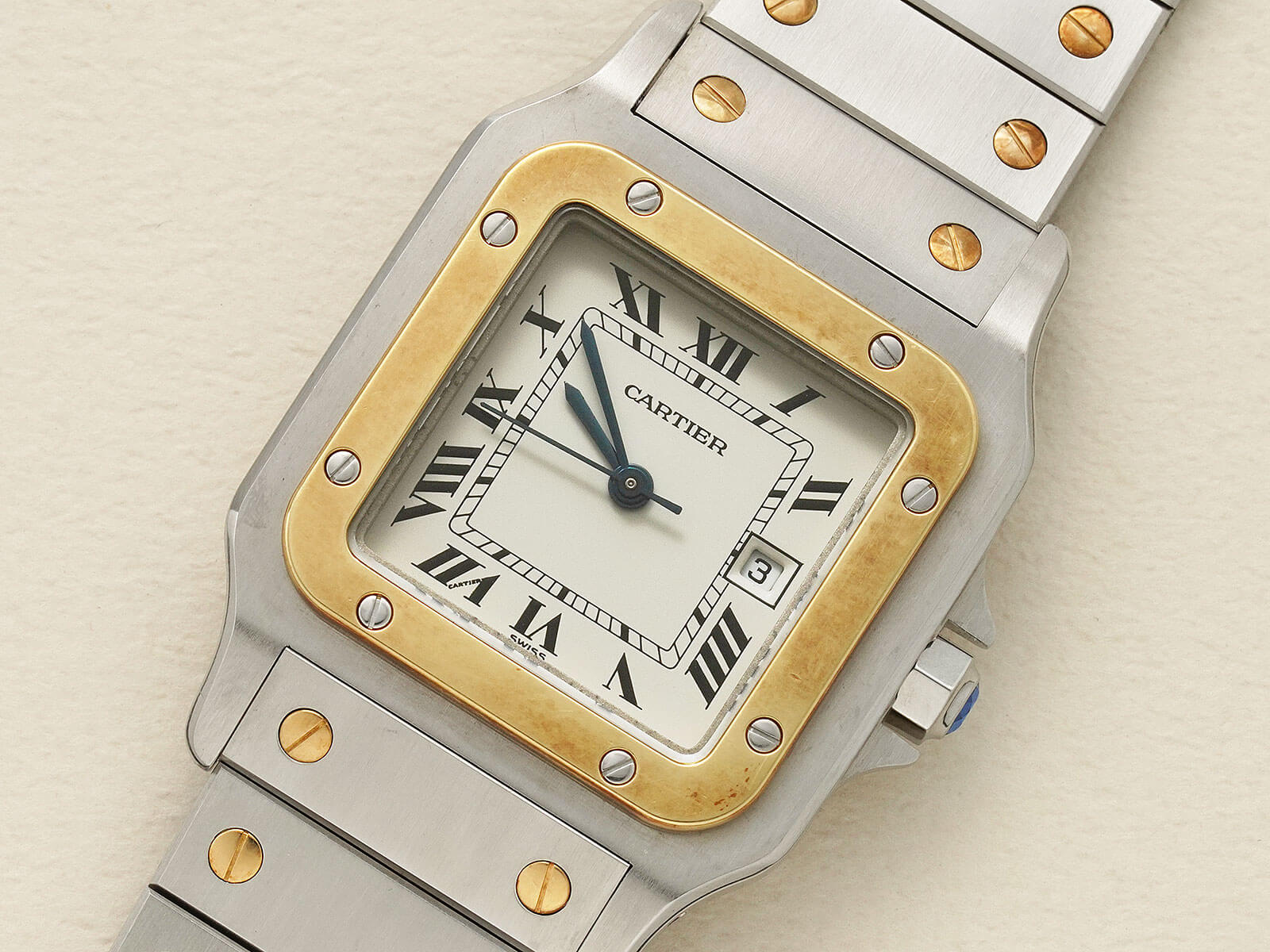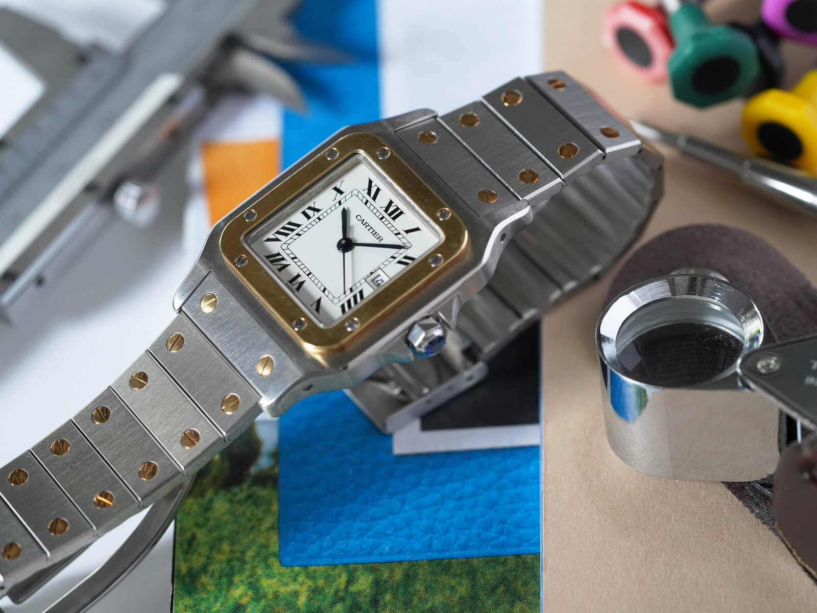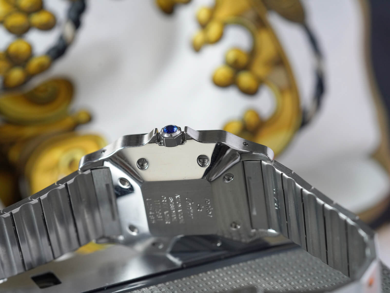 今回は、カルティエらしく品の良いテイストに、スポーティなデザインを融合させたモデルRef.2961のご紹介です。初代サントスデュモンを受け継いだ、飛行機の機体にあるビスモチーフのベゼルに、伝統のホワイトローマンダイヤルにサファイアカボションリューズと、ラブブレスのコンビカラーの美しさが際立つデザイン。ステンレスを使用したサントスは過去にも製造された事が無く、独特な感性で造り出された、近代的なラグジュアリースポーツの魅力を感じさせるモデルです。