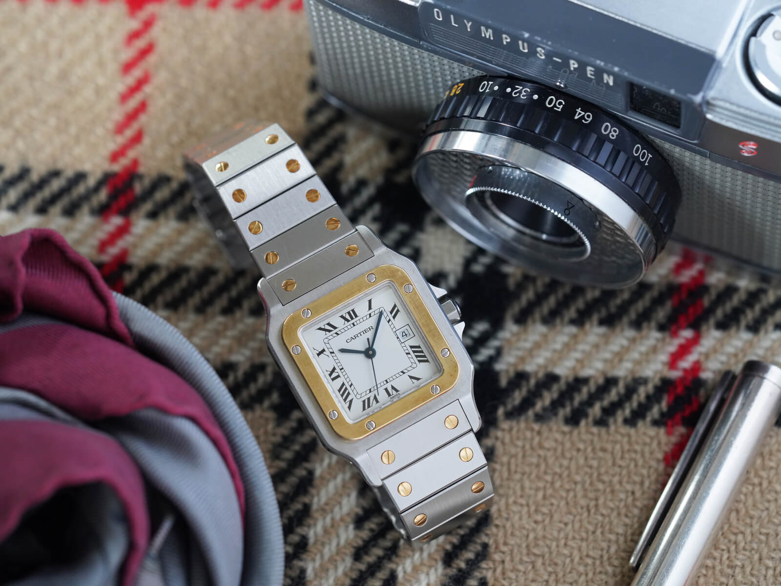1904年、当時のファッションリーダーとして知られるブラジル人飛行家のアルベルト・サントス=デュモンが、三代目当主のルイ・ジョゼ・カルティエに「飛行機の操縦中に時間を見るのが困難だ」と相談したことがきっかけで製作された「サントス」。懐中時計のように取り出す必要がないという実用性の高さが画期的で、世界初の腕時計となりました。