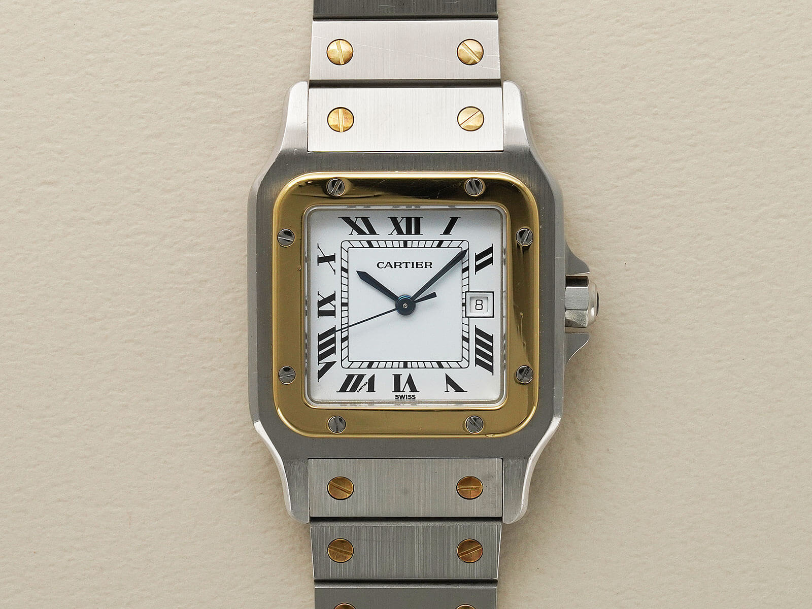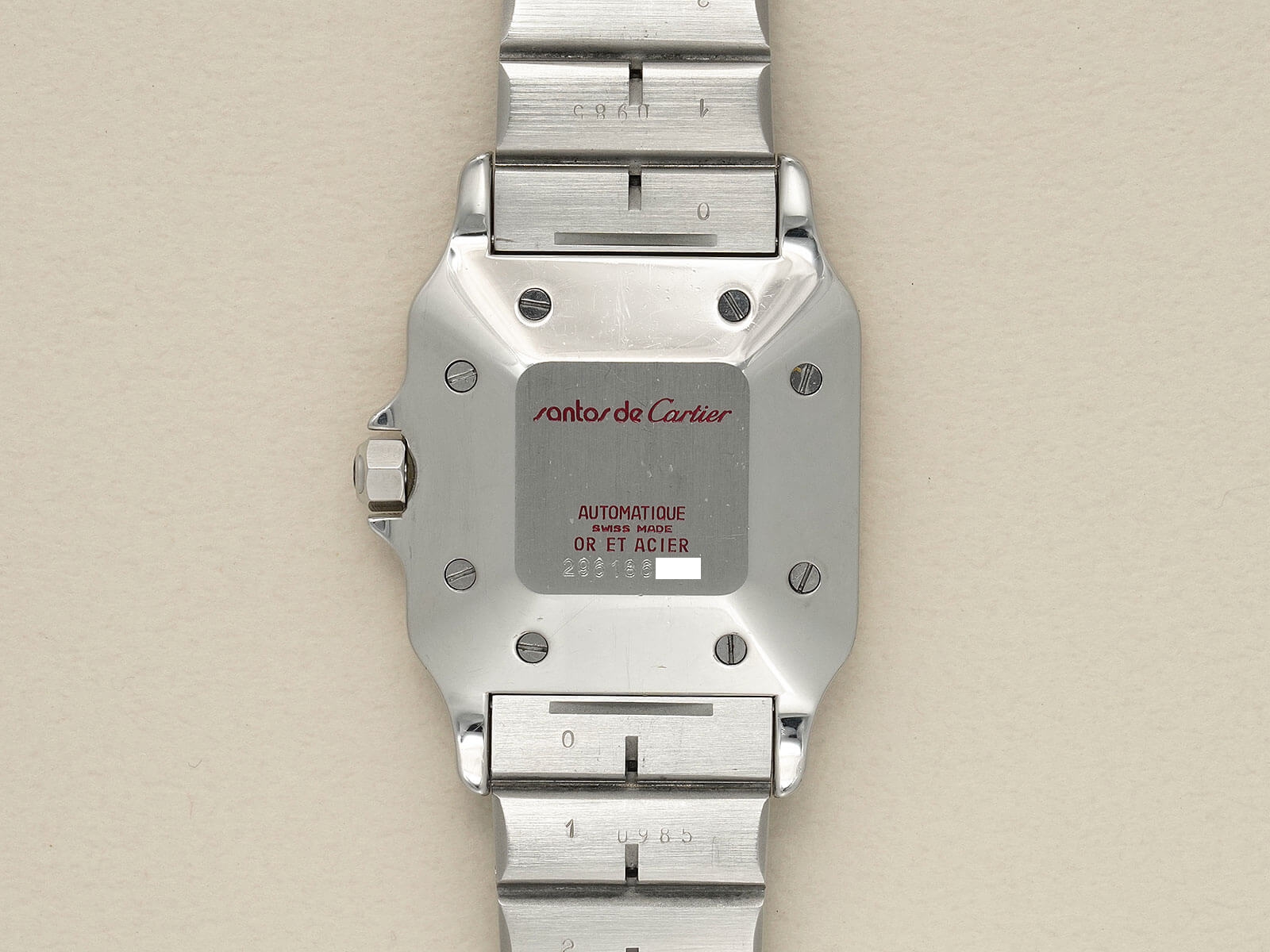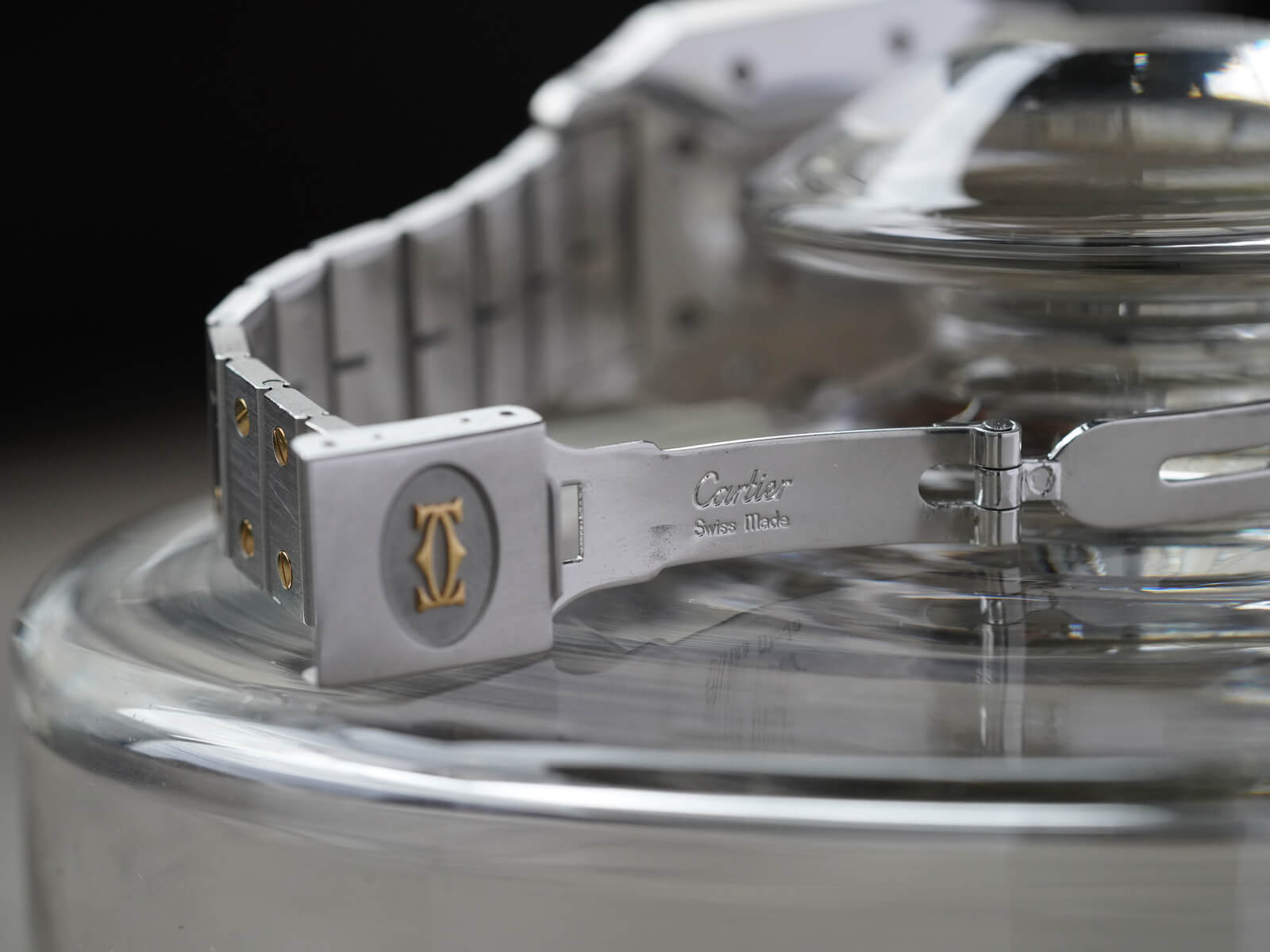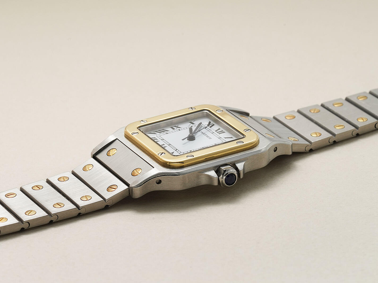 ブレスレットには、現在のバングルやリングにも使用されている、人気デザインの通称「ラブブレスレット/Love Bracelet」に、初期型カルティエロゴ入リシングルバックルがセッティング。初代サントスデュモンの特徴を受け継いだ完璧なフォルムの中に、洗練されたジュエリー要素を感じさせ、時を超えた今でも人々を魅了してくれる素敵な時計です。ケースの状態も良く実物を是非見て頂きたい個体です。
