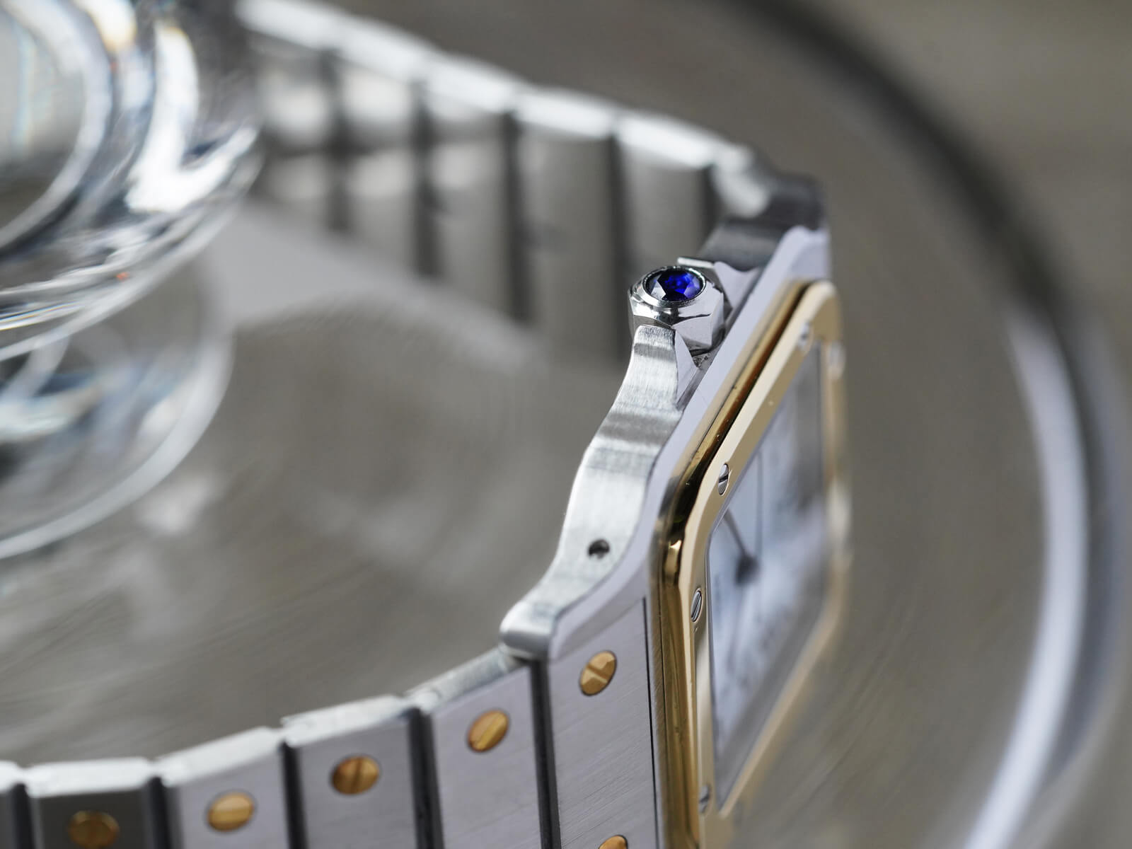 今回は、そんな歴史的背景のあるモデルの系譜である、サントスガルベLM・Ref.2961のご紹介です。ビスモチーフを配したベゼルのスポーティなデザインに、カルティエらしく品の良いドレステイストを融合させた魅力的なモデルです。カルティエ伝統のホワイトローマンダイヤルに、職人の手によって焼き入れされたことで絶妙な光沢を放つブルースチールハンドや、サファイヤカボションリューズ等の美しさを引き立たせた素晴らしいデザイン。伝統の宝飾技術に近代的な機能美を感じさせる、カルティエらしい一本です。