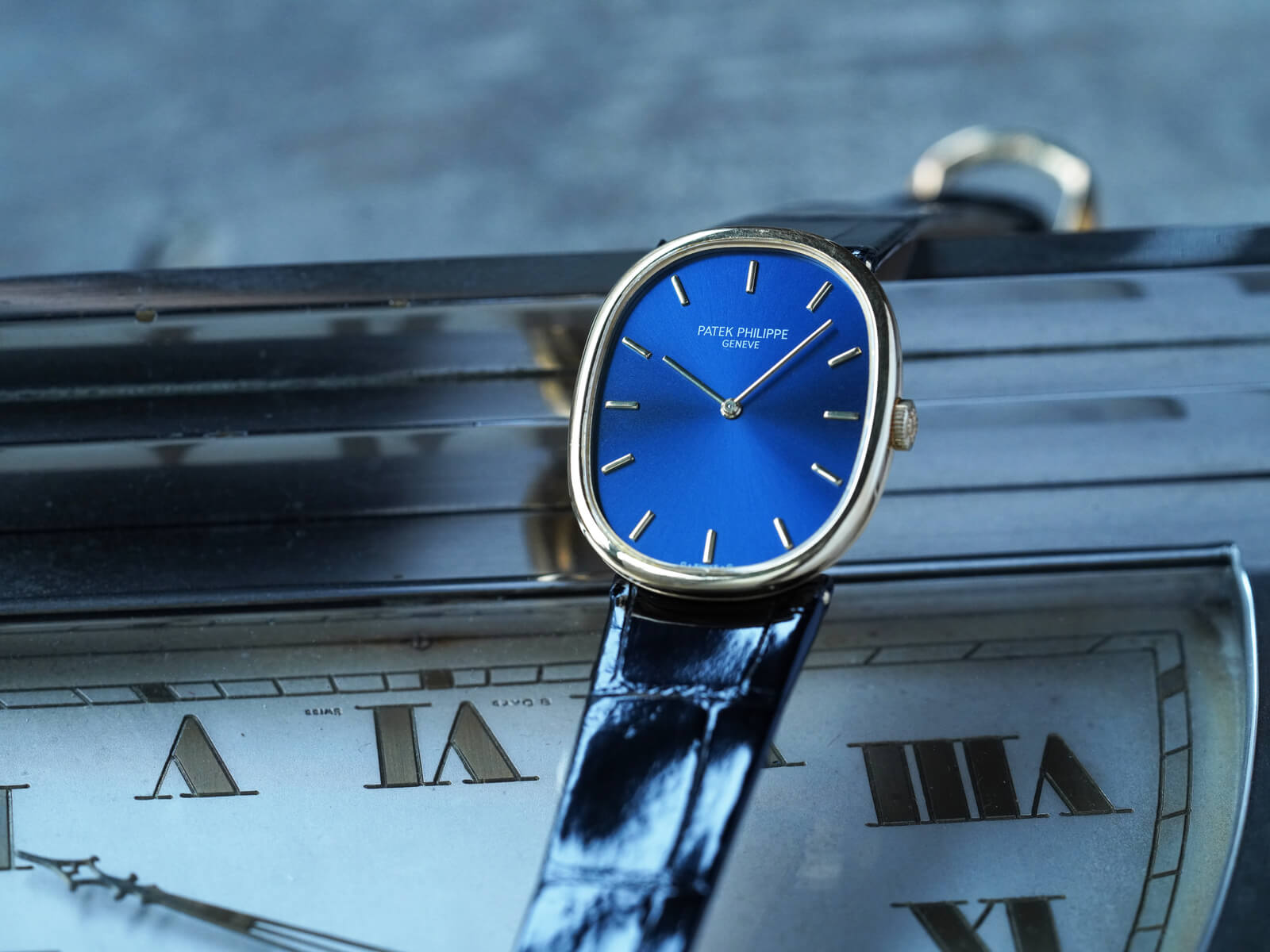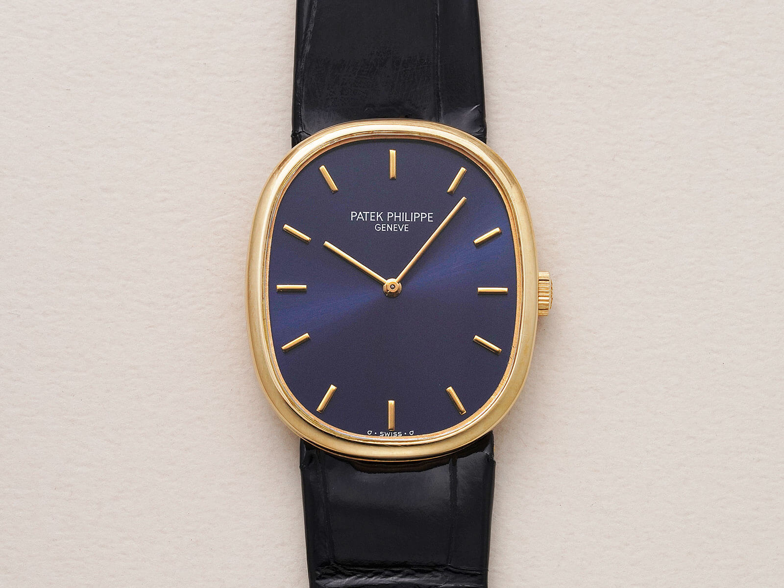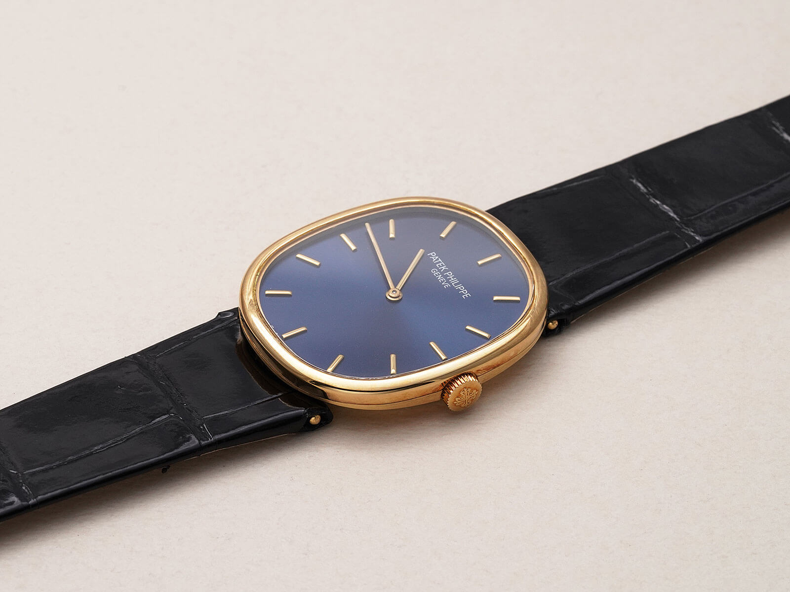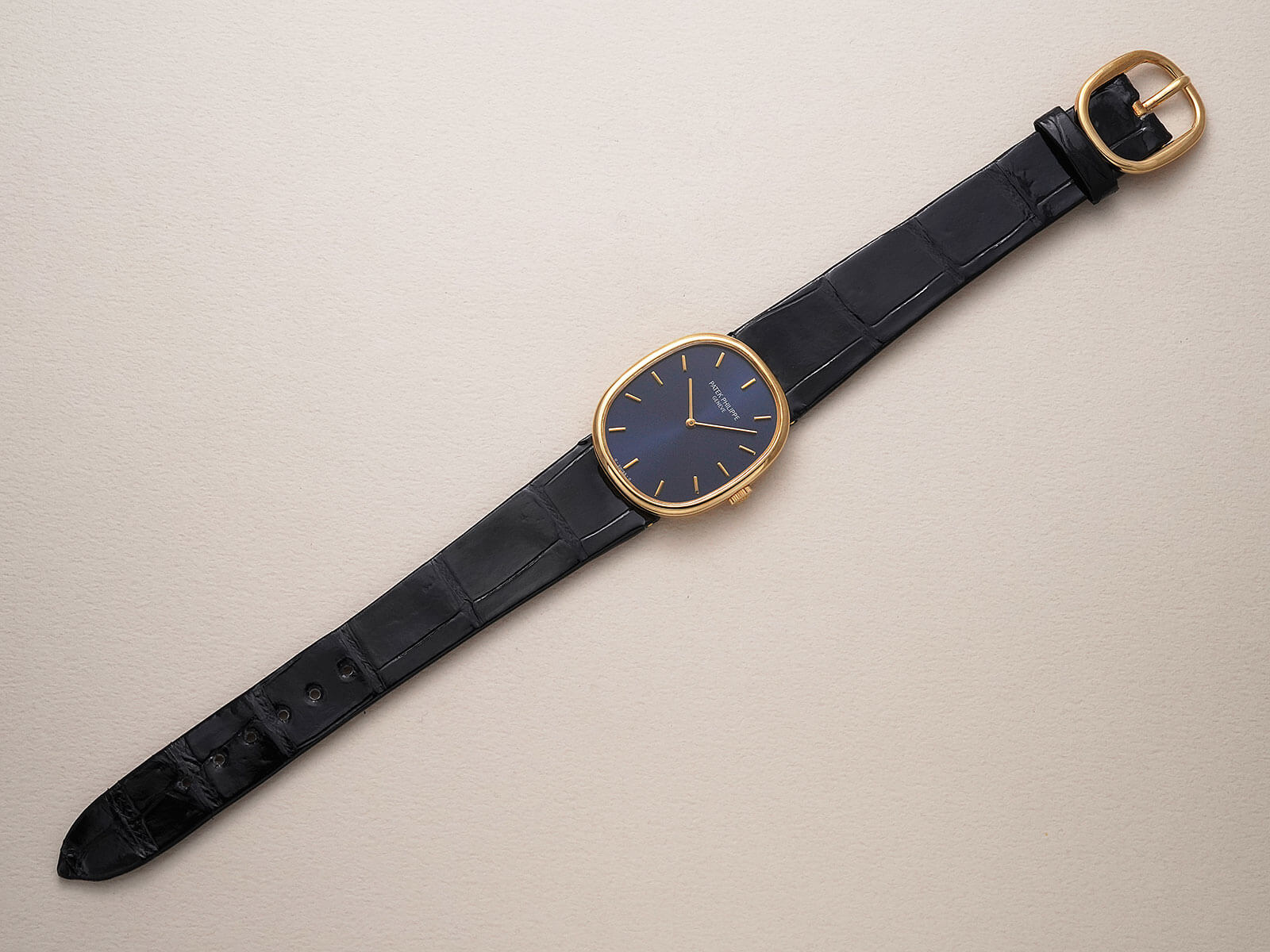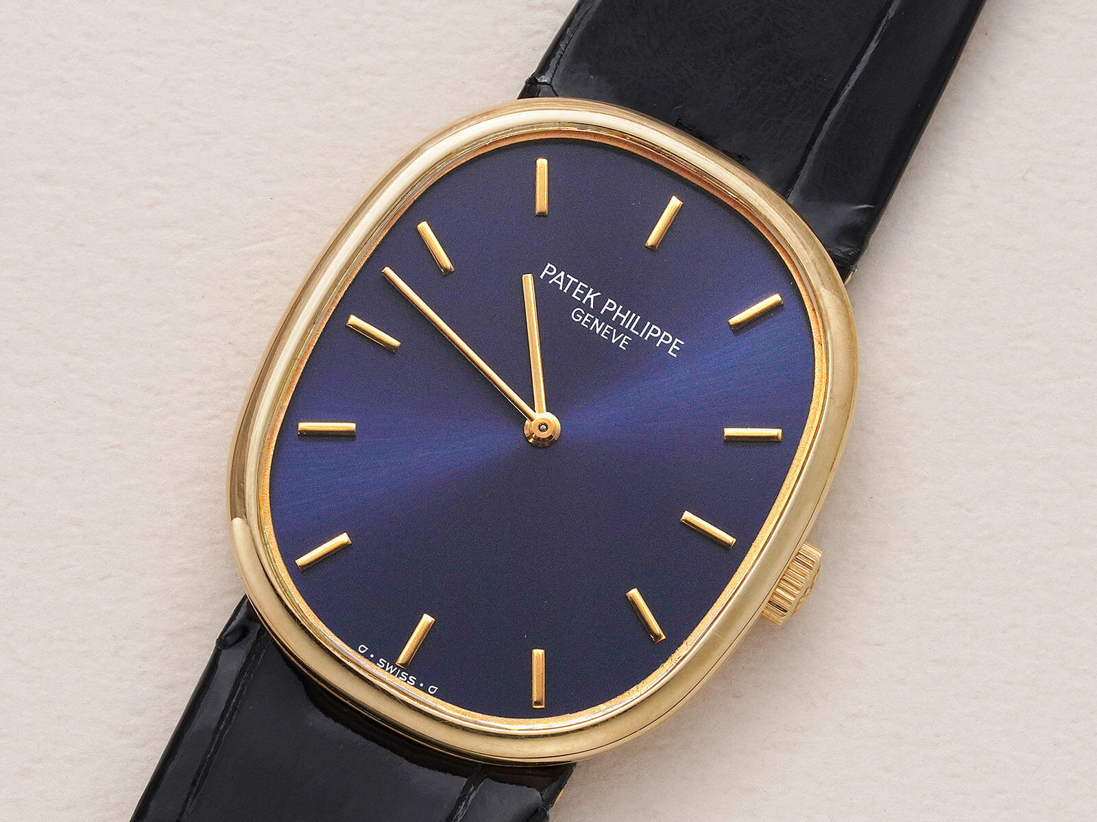 今回は、秀逸なバランスで綺麗な形を演出されたイエローゴールド製のモデルRef.3848J・ゴールデンエリプスのご紹介です。ヨーロッパの古典建築や絵画において理想的とされる、「黄金分割法」に基づいた独特なケースデザインに、光の具合で変わる表情豊かなブルーダイヤルで、配色が醸し出す美しいコントラストを演出。ダイヤルの素材に「金」を使用していることを示した「シグマ/σ」マークを6時下に表記し、最小限のシンプルなフェイスでありながら、強い拘りを感じさせてくれる極上の一本です。