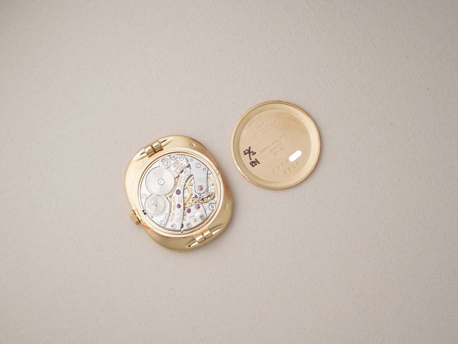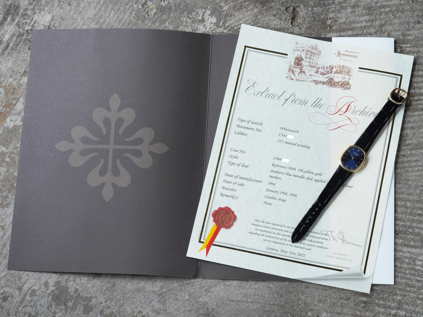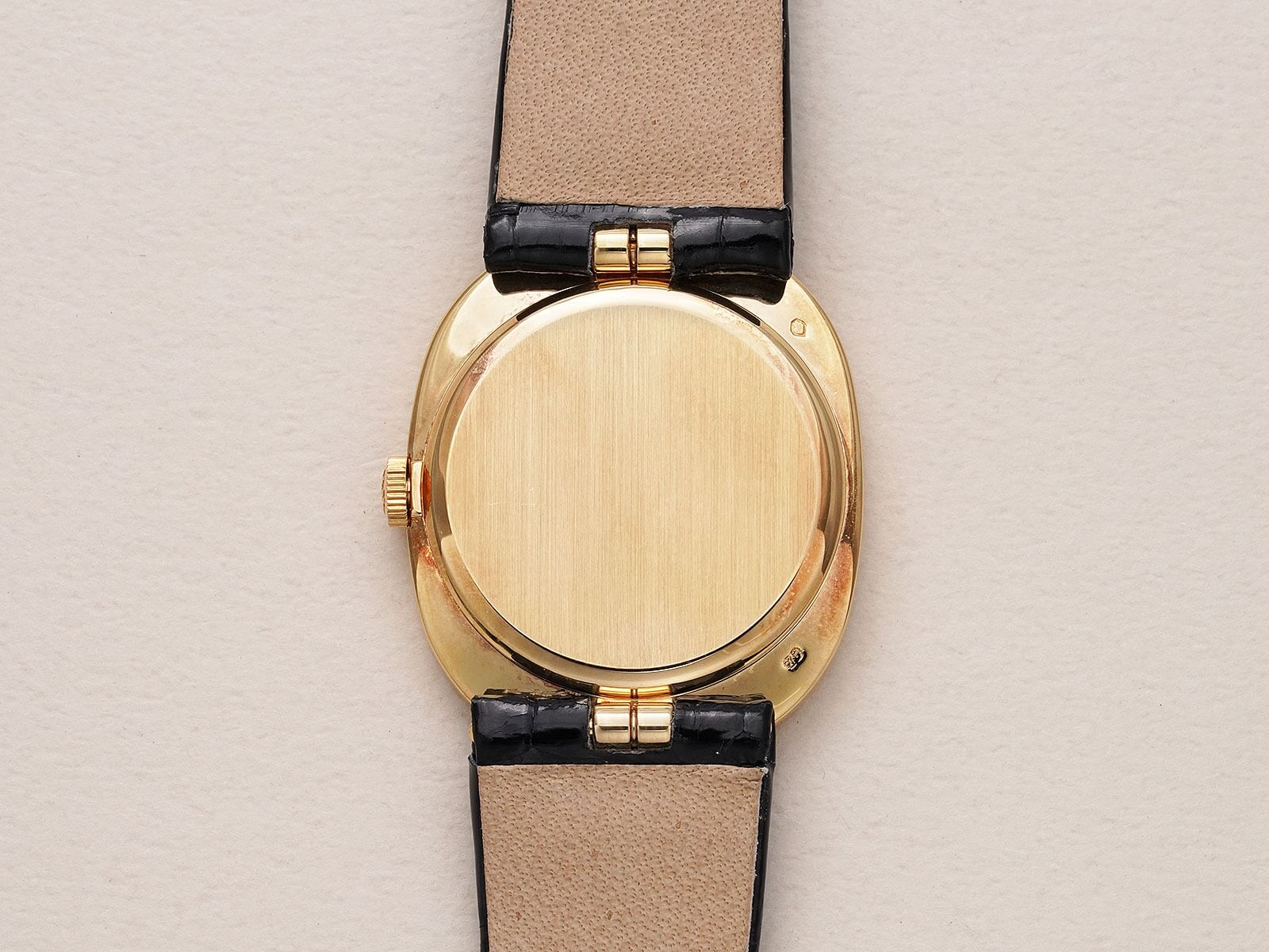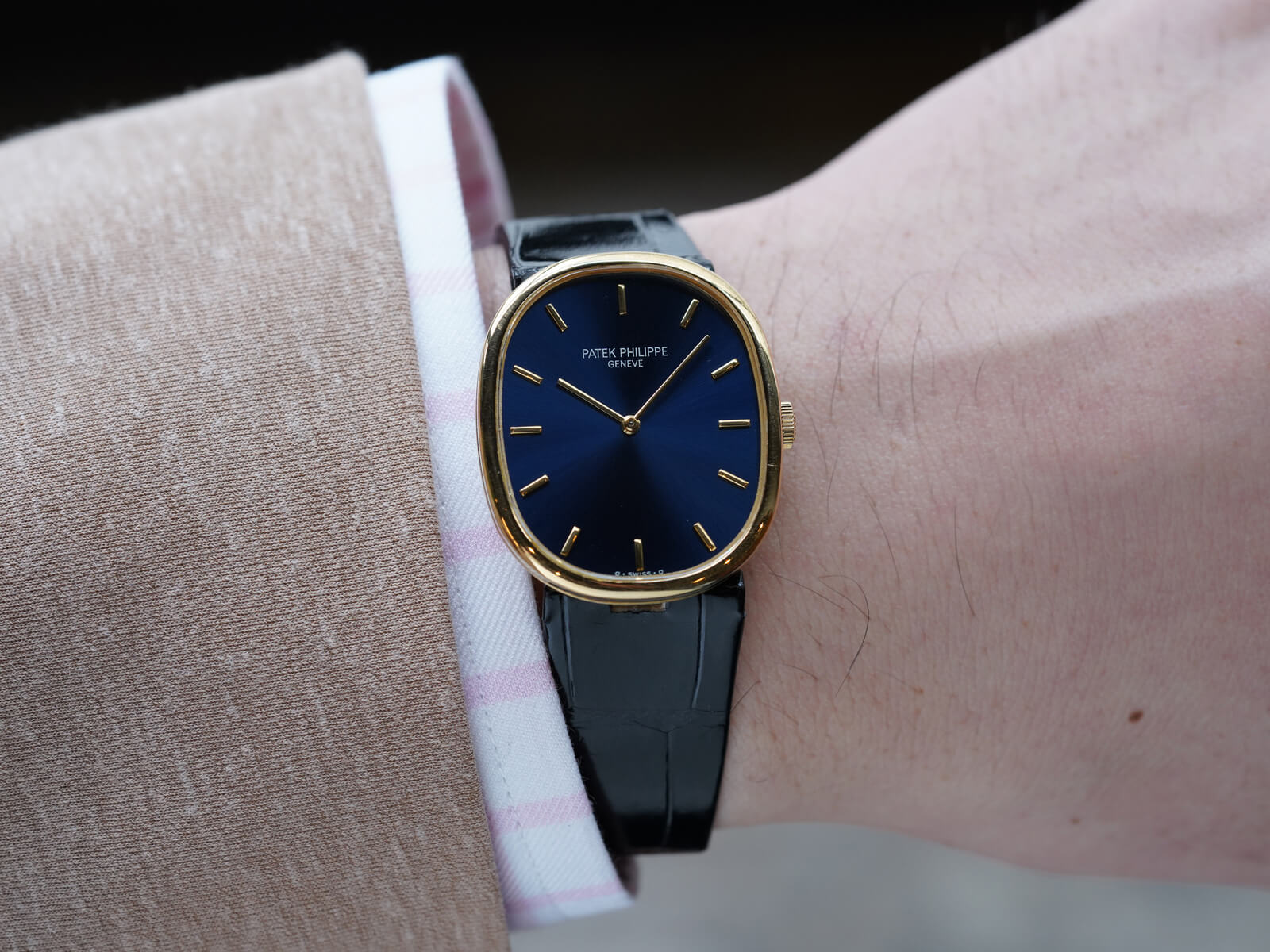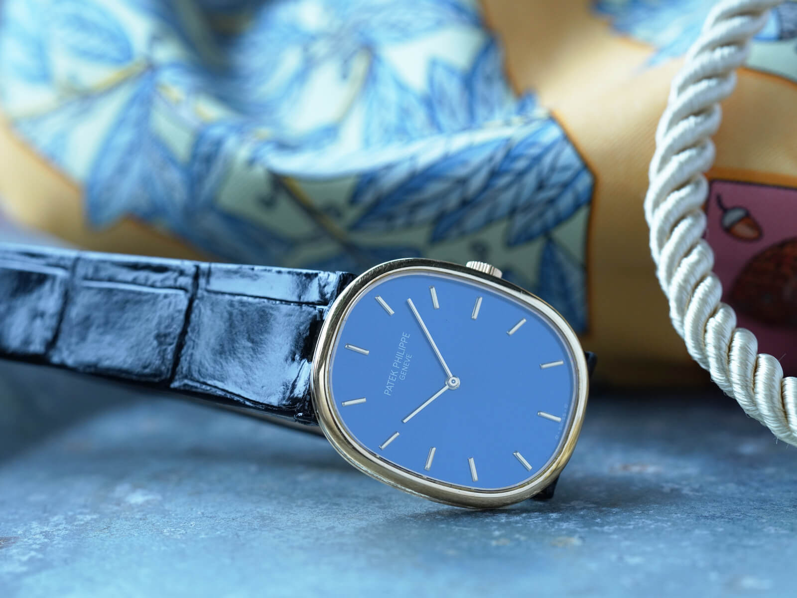 今回は、秀逸なバランスで綺麗な形を演出されたイエローゴールド製のモデルRef.3848J・ゴールデンエリプスのご紹介です。ヨーロッパの古典建築や絵画において理想的とされる、「黄金分割法」に基づいた独特なケースデザインに、光の具合で変わる表情豊かなブルーダイヤルで、配色が醸し出す美しいコントラストを演出。ダイヤルの素材に「金」を使用していることを示した「シグマ/σ」マークを6時下に表記し、最小限のシンプルなフェイスでありながら、強い拘りを感じさせてくれる極上の一本です。