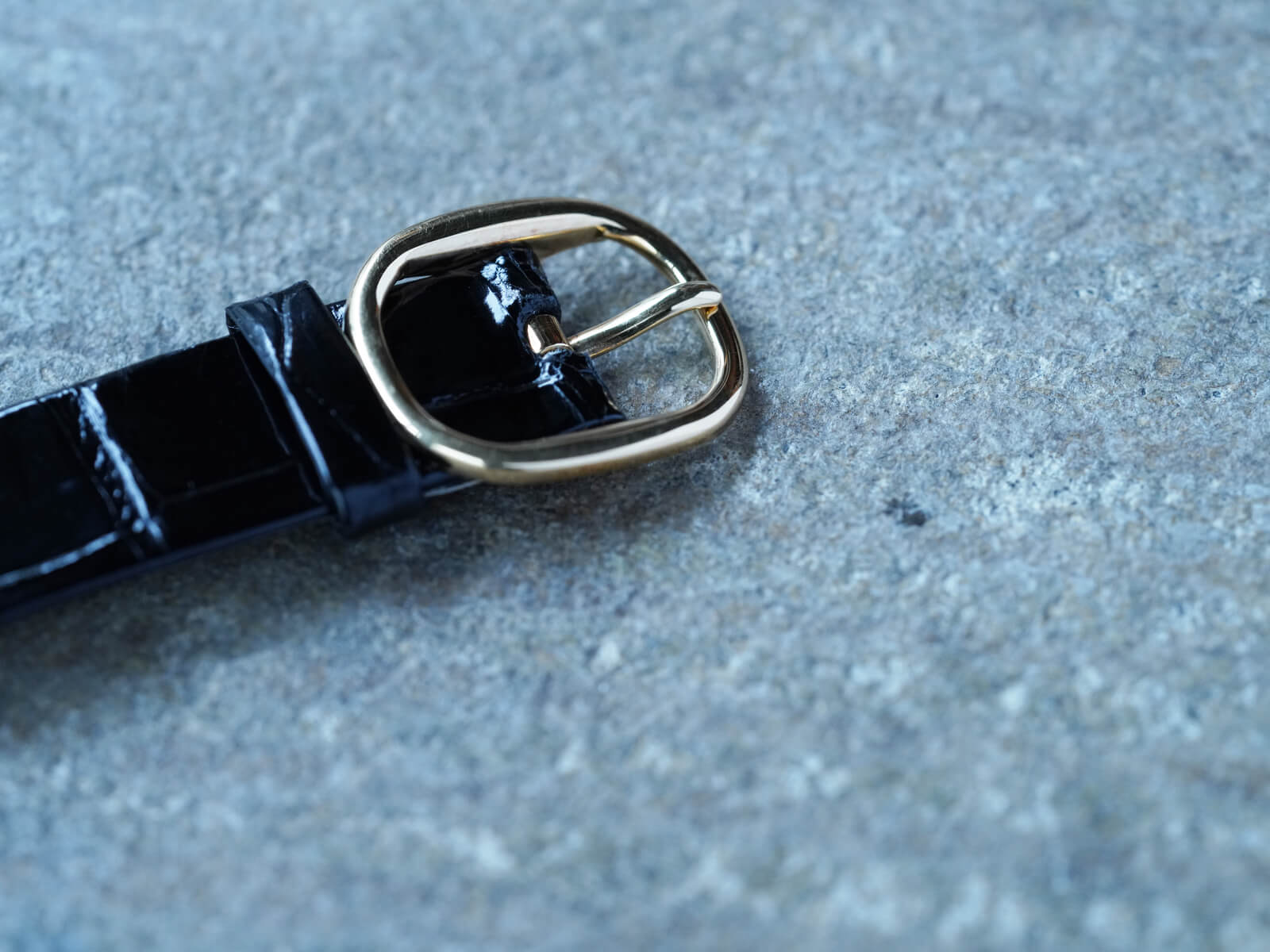 レザーブレスには、当店オリジナルのクロコダイルレザーのシャイニーブラックをセレクトし、イエローゴールド製の純正尾錠が付属されております。小ぶりで綺麗なフォルムに引き締まったフェイスで、お手元に彩りを演出してくれるお洒落な時計です。是非店頭にてご覧ください。