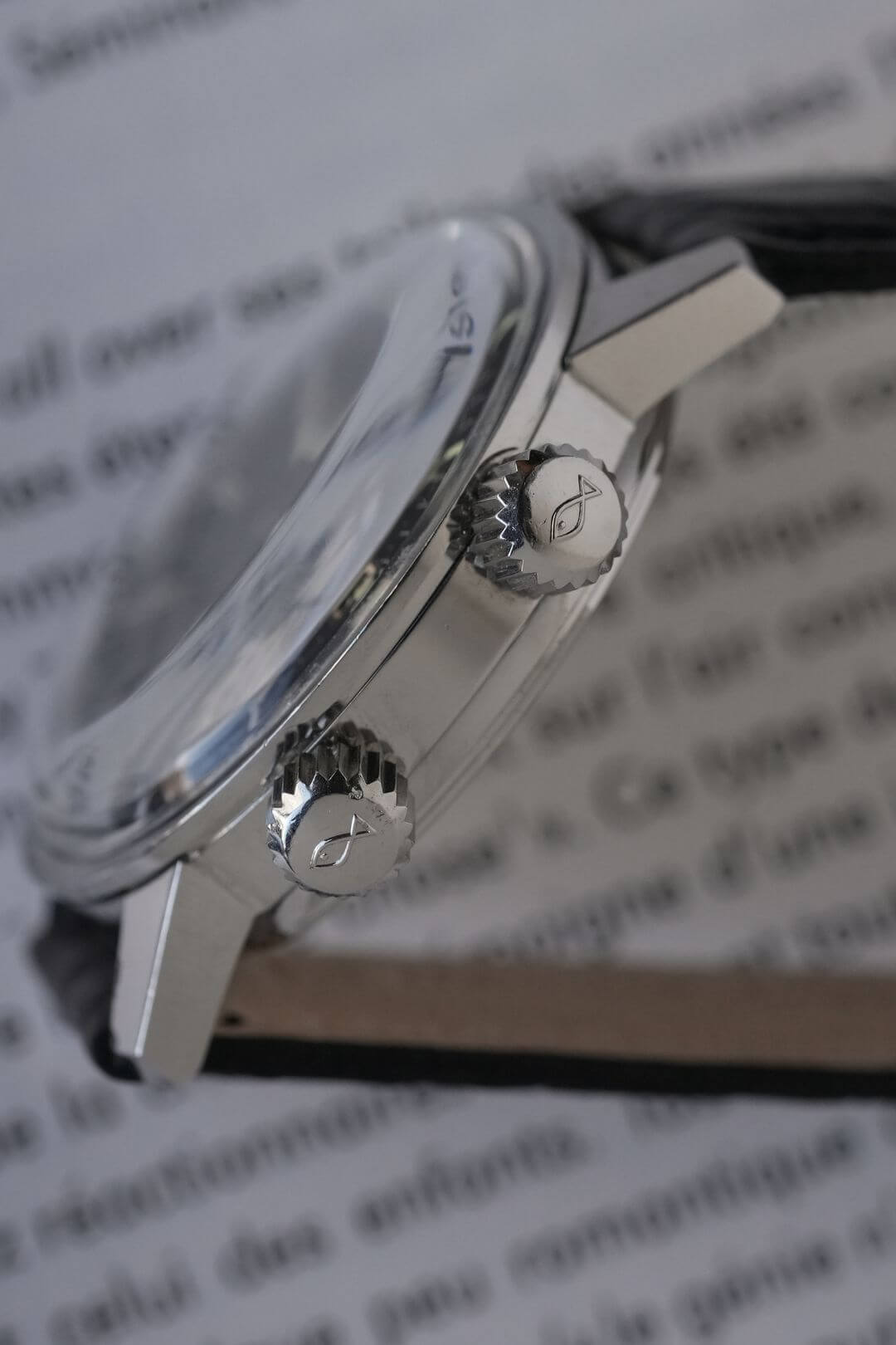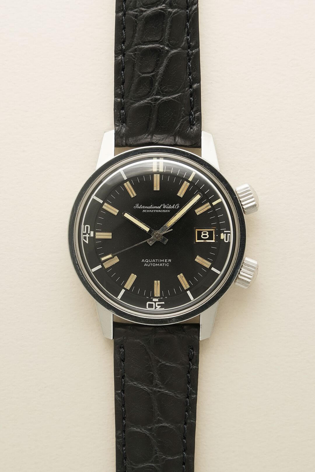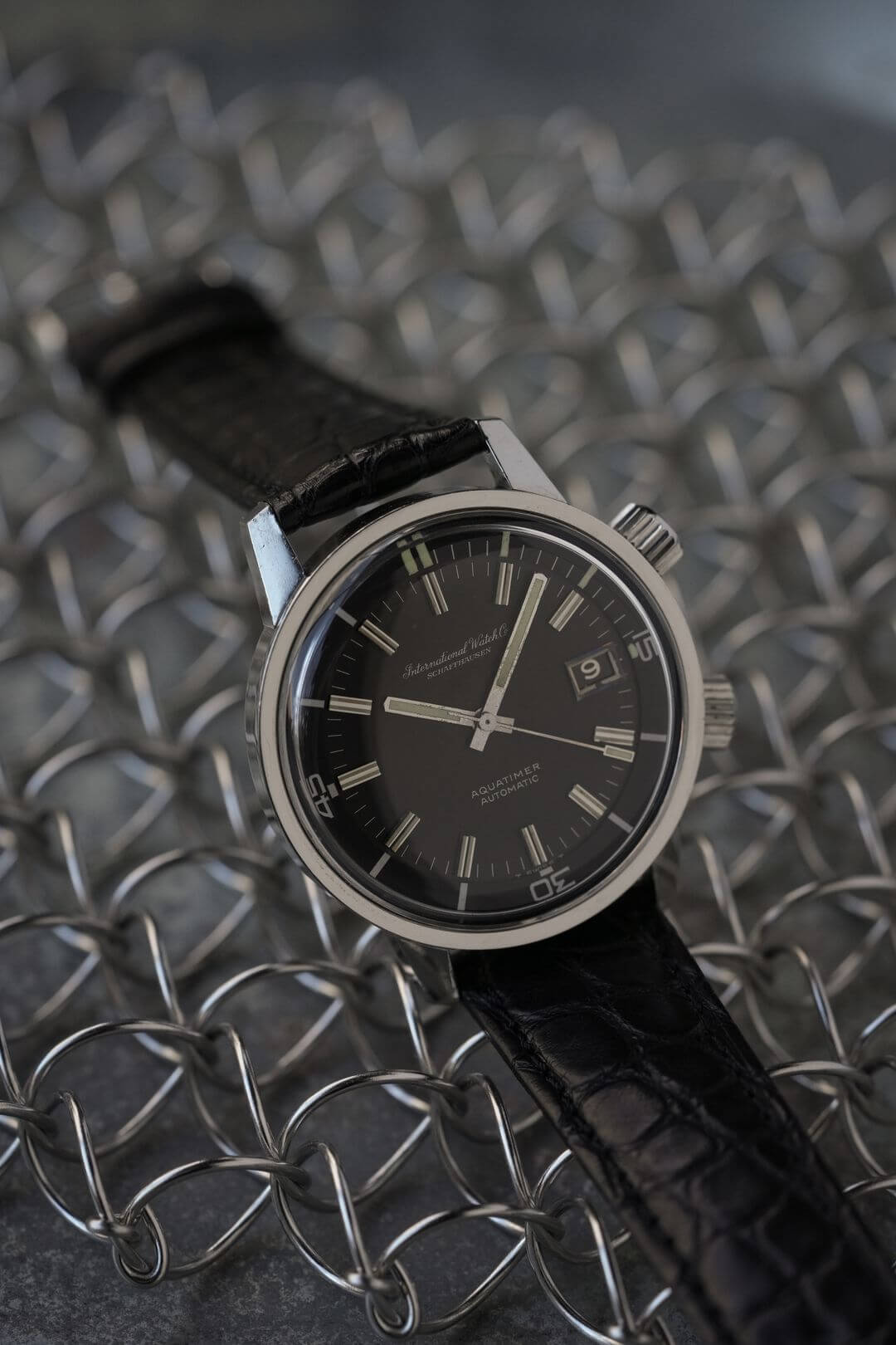 今回は、1967年に登場したIWCを代表するダイバーズモデル[Aquatimer/アクアタイマー]の初代モデル、Ref.812のご紹介です。一般的なダイバーズウォッチとは異なり、風防の内側に回転式のインナーベゼルを備え、2時位置のリューズで操作できる仕様となっています。ケースは、数多くの名作に採用されたE.P.S.A.社製のスーパーコンプレッサーケースを使用し、潜水時間計測時の誤操作を防ぐためのツインリューズが特徴です。巻き上げのしやすい大型の“魚リューズ”や、先端に長方形のポインターを備えた通称“炉端焼き秒針”も健在で、オールドインターのファンにはたまらない魅力を備えています。