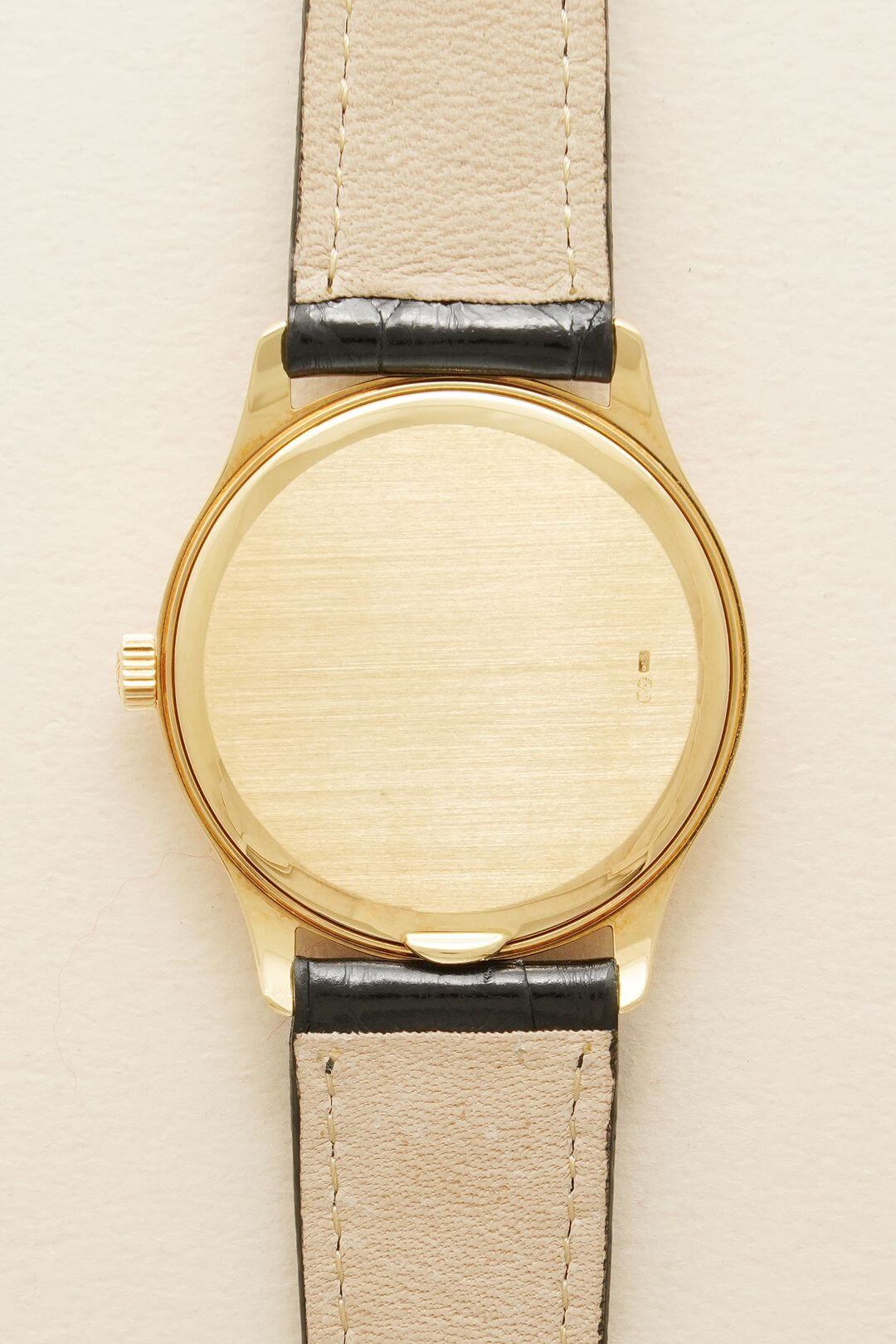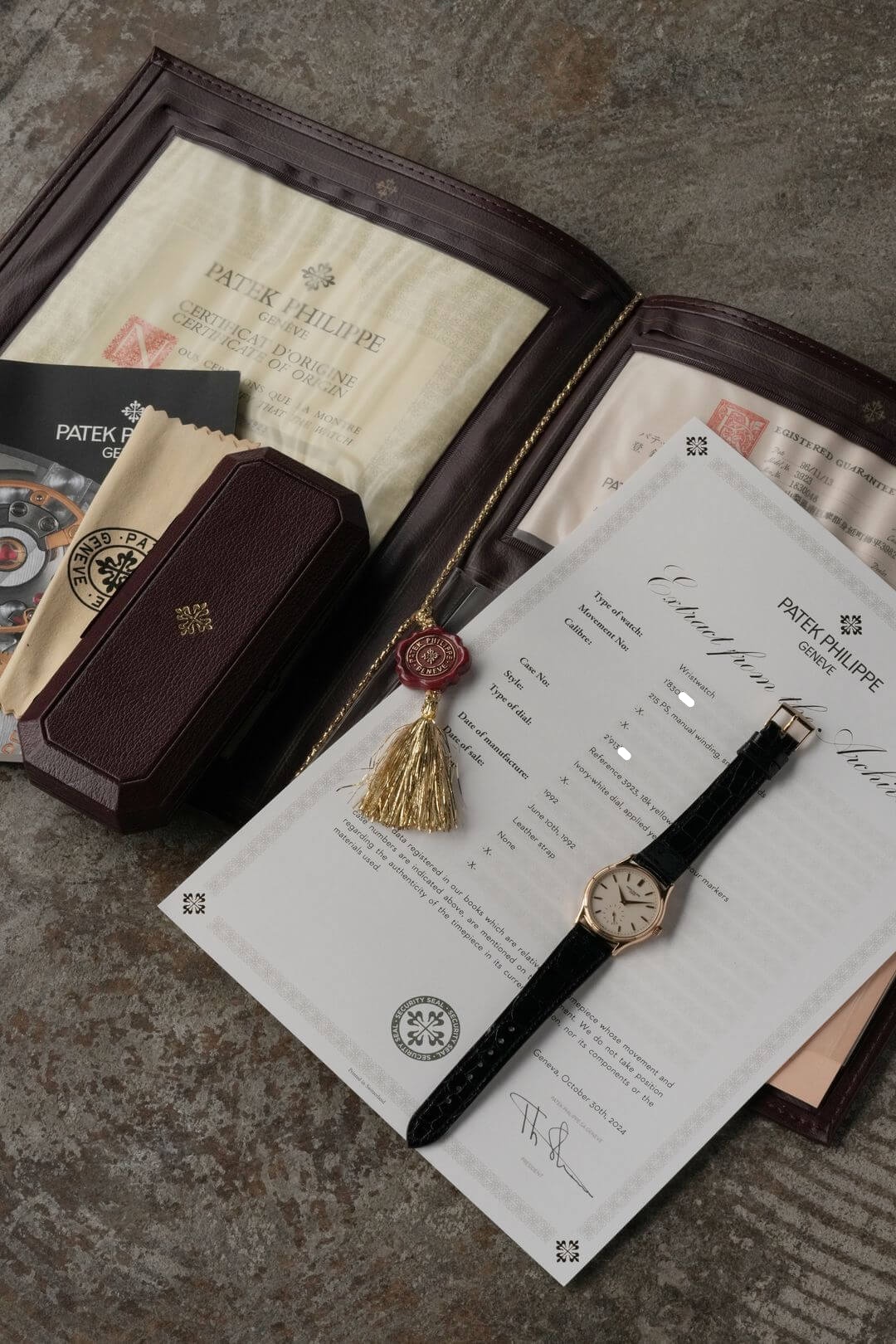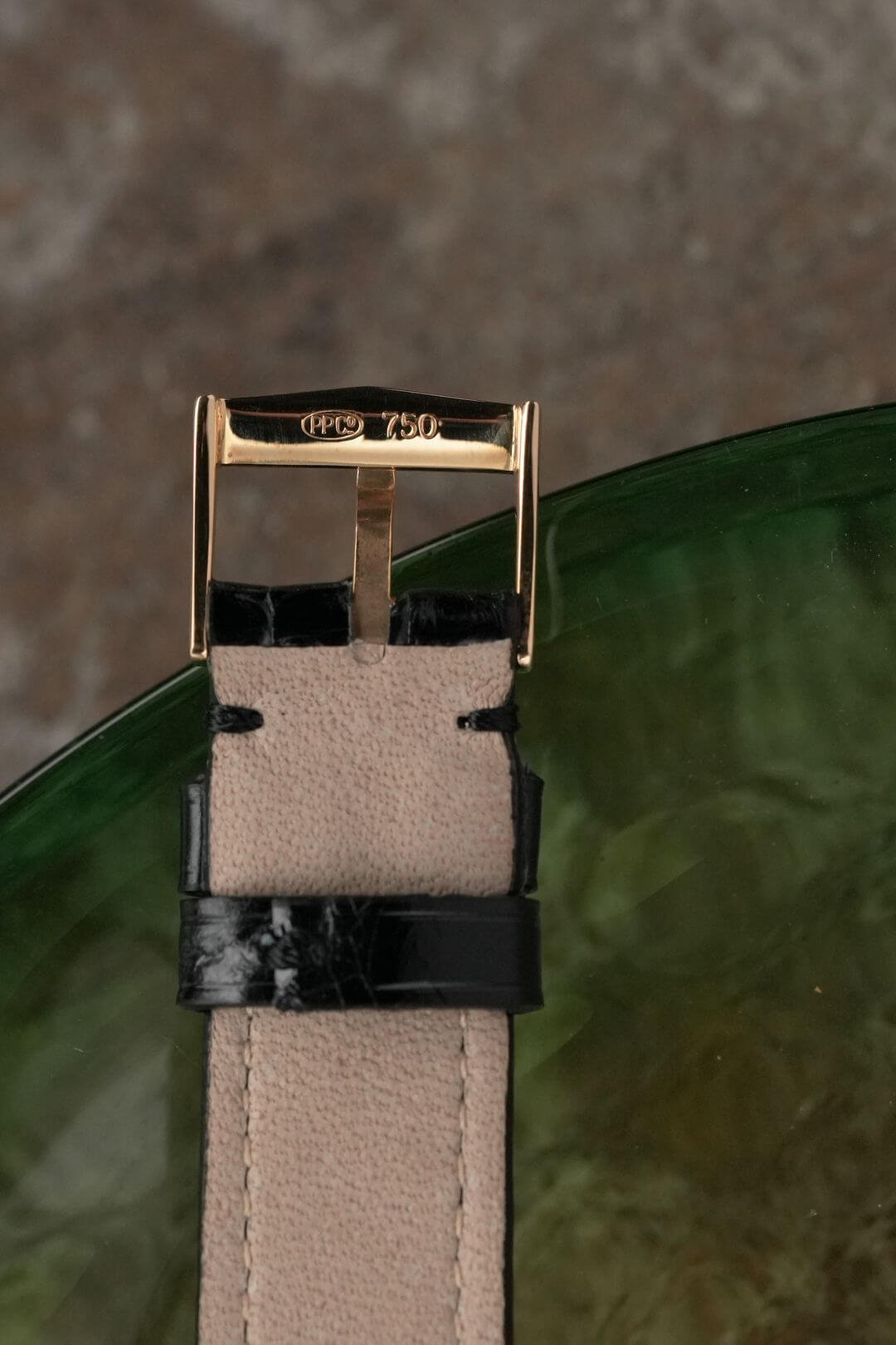 レザーブレスには、当店オリジナルのクロコダイルレザーのシャイニーブラックをセッティング。貴重なイエローゴールド製パテックフィリップ純正尾錠も付属しておりますので、共にお使い頂くことをお勧めいたします。さらには、パテックフィリップにより発行されたアーカイブを2024年10月に取得し、純正ボックスや販売当時の保証書も付属しておりますので、お買い上げの際にお渡しいたします。小ぶりなモデルを好む男性は勿論の事、女性にもご着用頂けるサイズ感で、凛々しい顔立ちの格別なオーラを放った逸品。シンプルな美しさを備えた、大人の魅力を引き立たせてくれる素敵な時計です。是非、店頭にてご覧ください。