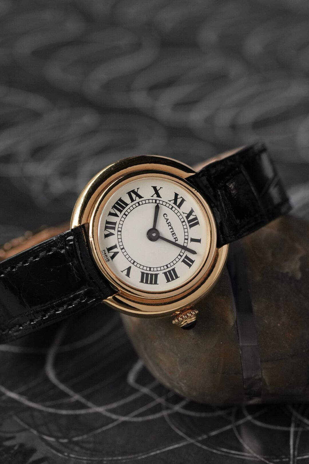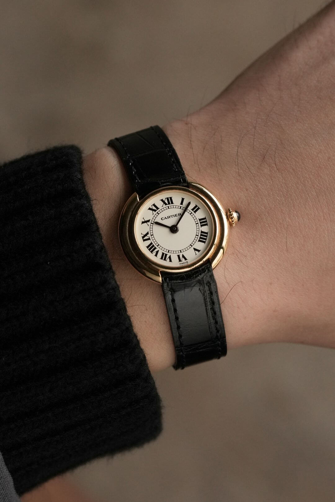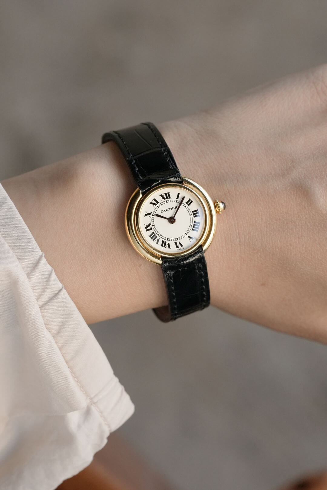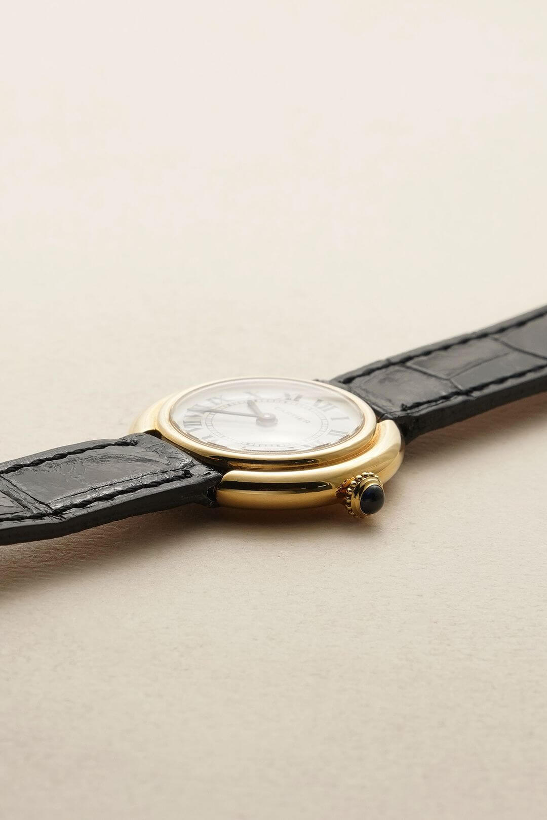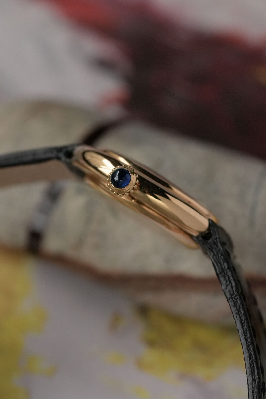 今回は、イエローゴールド製のケースとダブルラインが印象的なRef.67080のご紹介です。アールデコの要素を取り入れたエレガントなデザインは、女性らしい美しさを一層引き立てます。70年代を彷彿とさせるPARIS表記のホワイトローマンダイヤル、ブルースチールハンド、そしてサファイアカボションリューズなど、カルティエの伝統が息づくディテールも健在。時代を超えた普遍的な魅力を備えています。