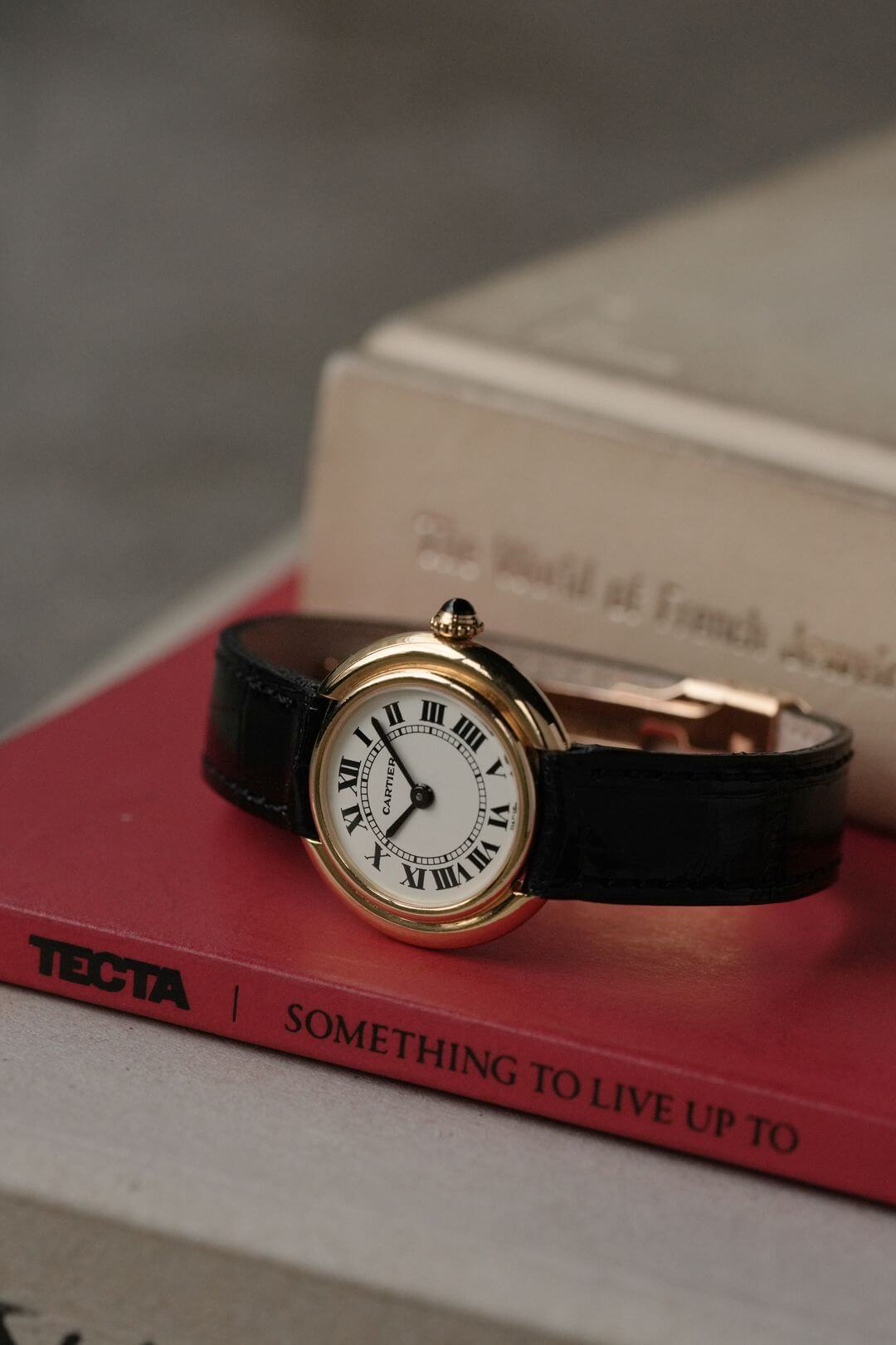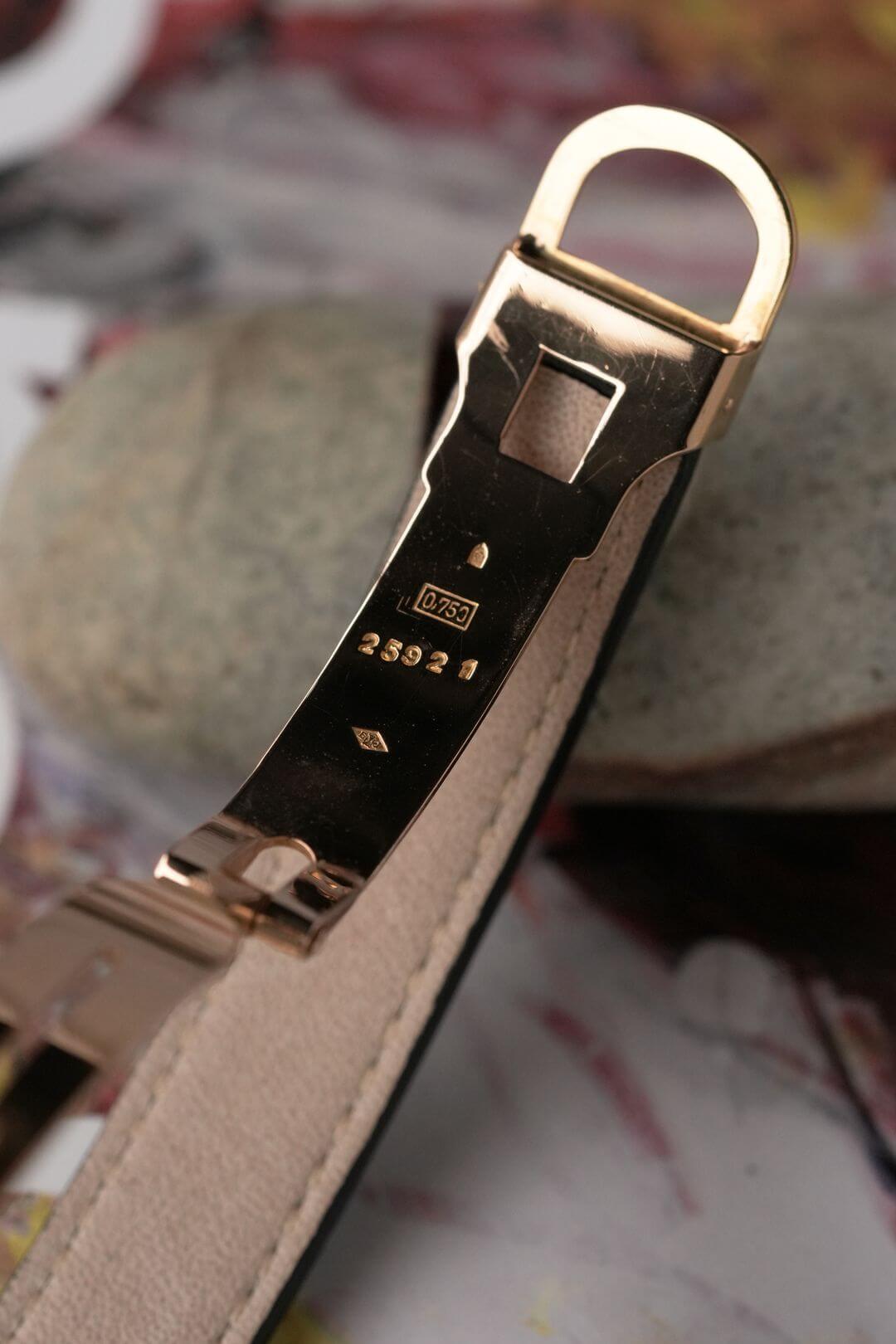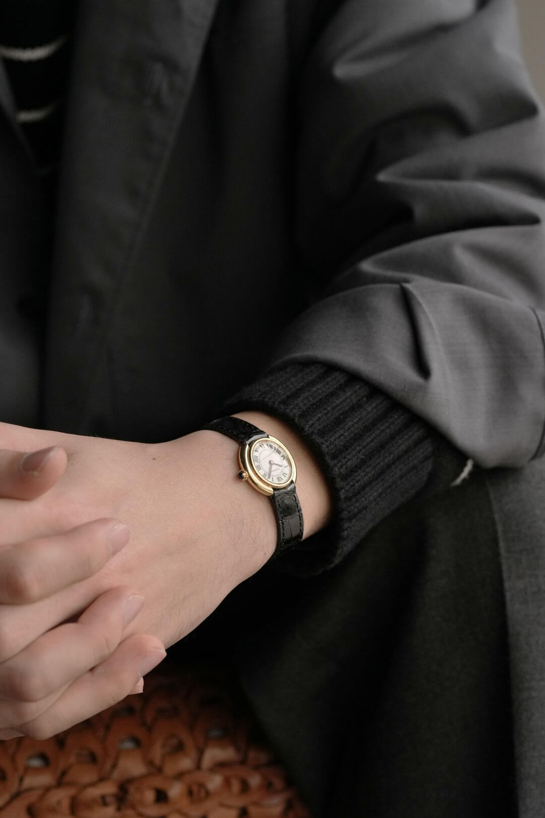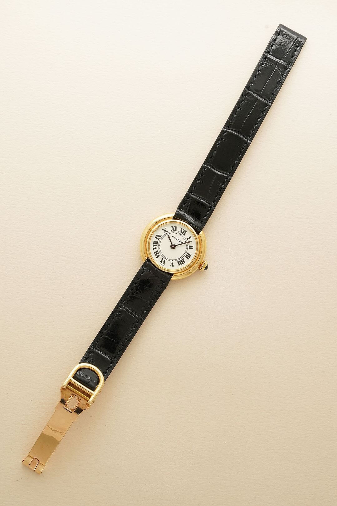 レザーブレスには、当店オリジナルのクロコダイルレザーのシャイニーブラックをセッティング。イエローゴールド製のカルティエ純正Dバックルが付属します。旧型のためサイズ調整ができない仕様ですが、現状のベルトが合わない場合は、無料で製作いたします(納期:約1か月半)。