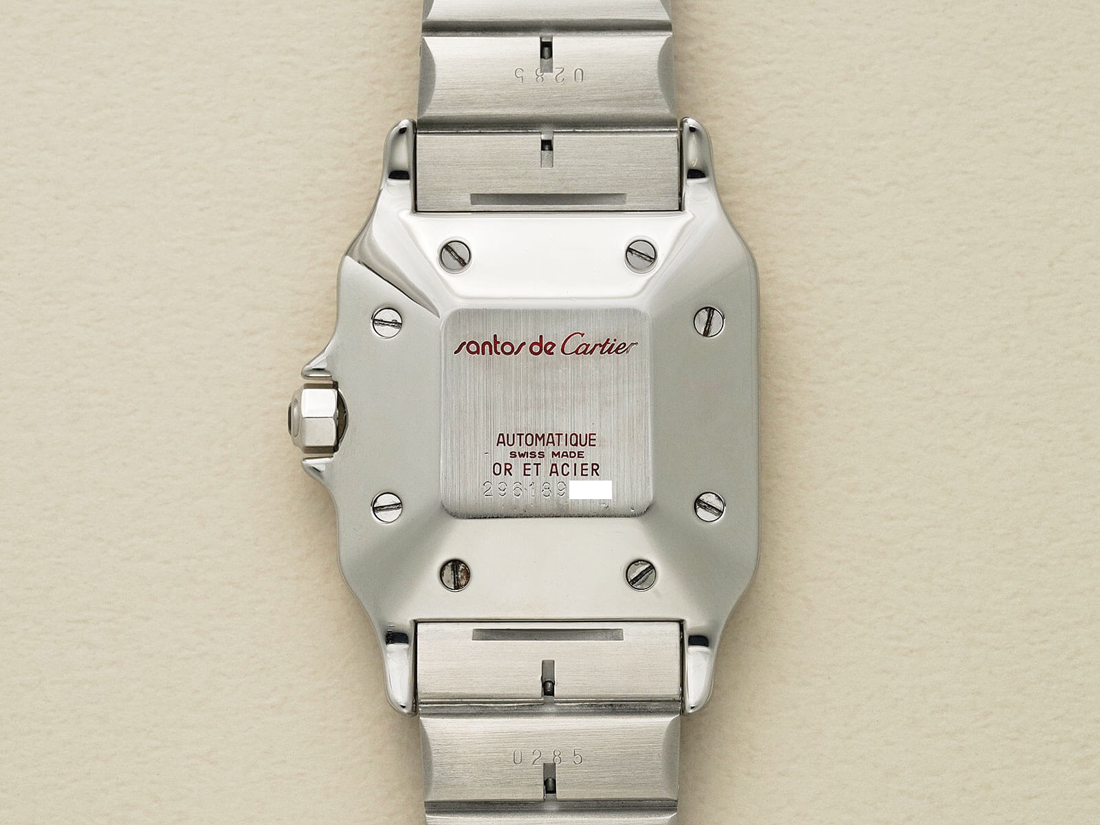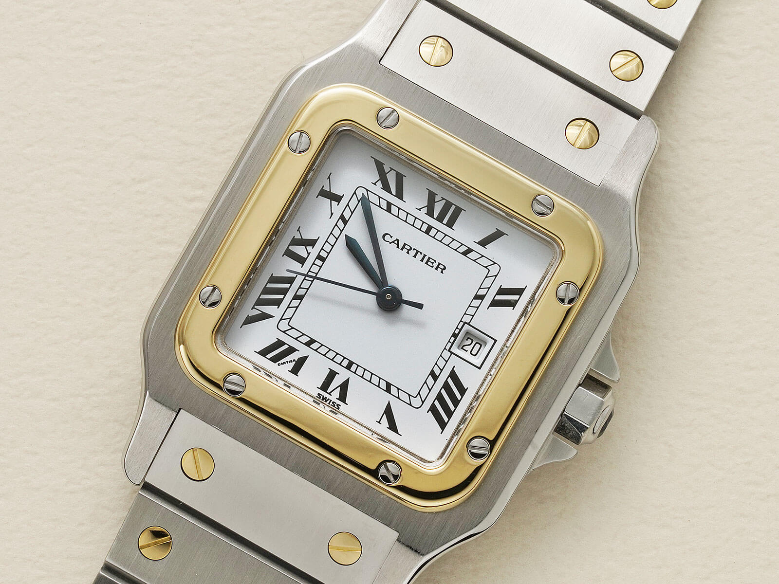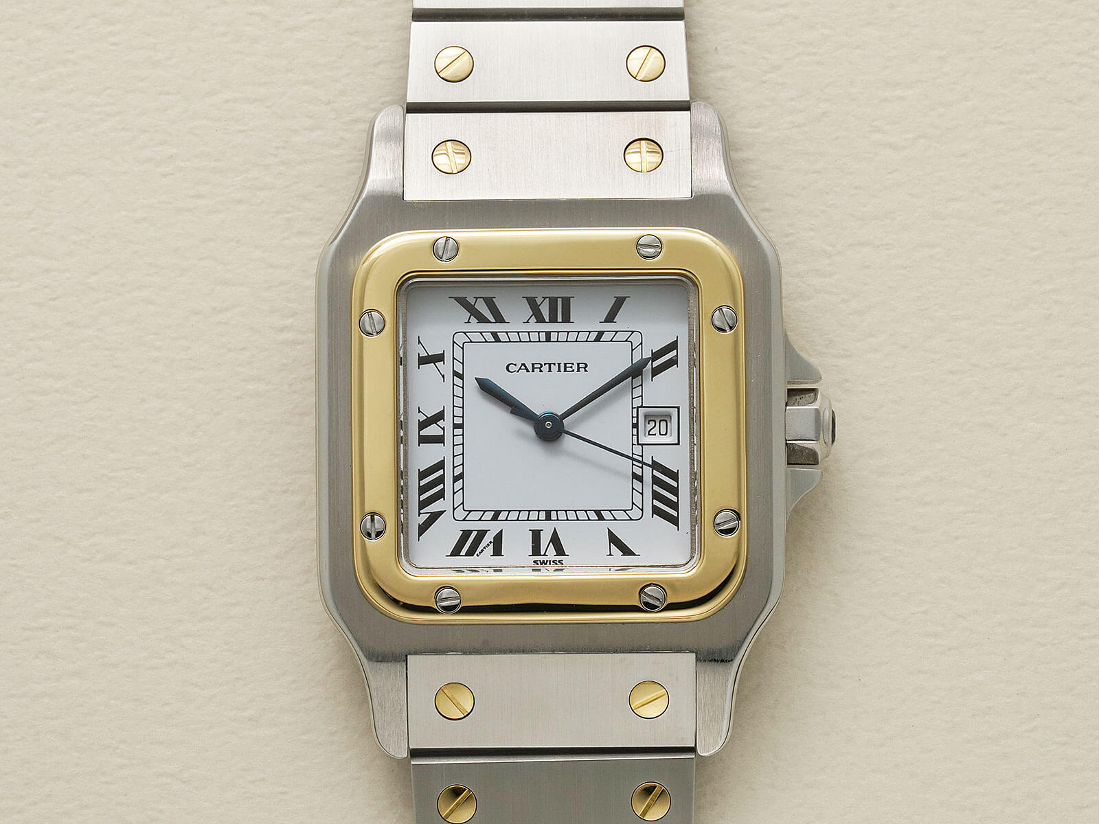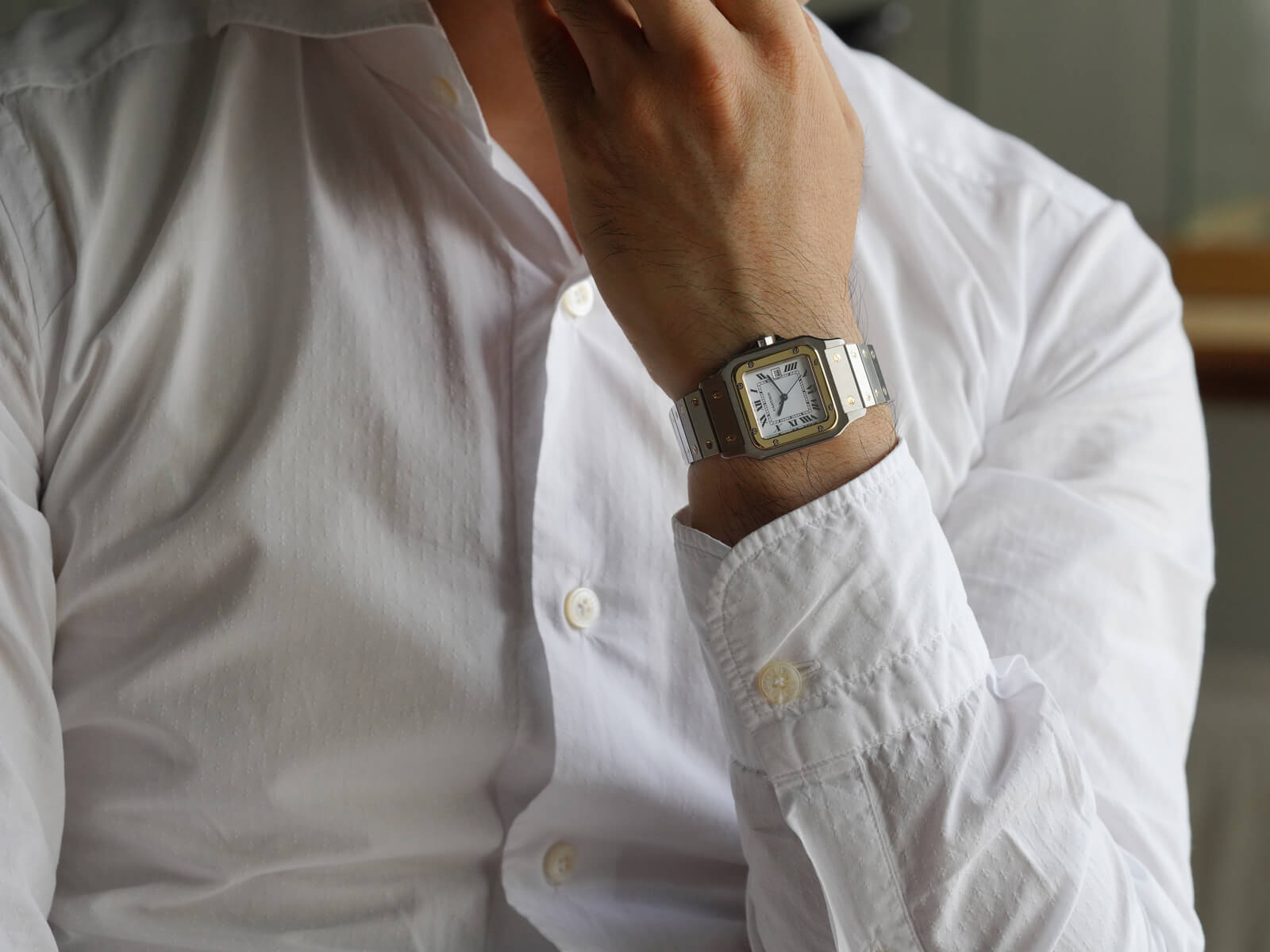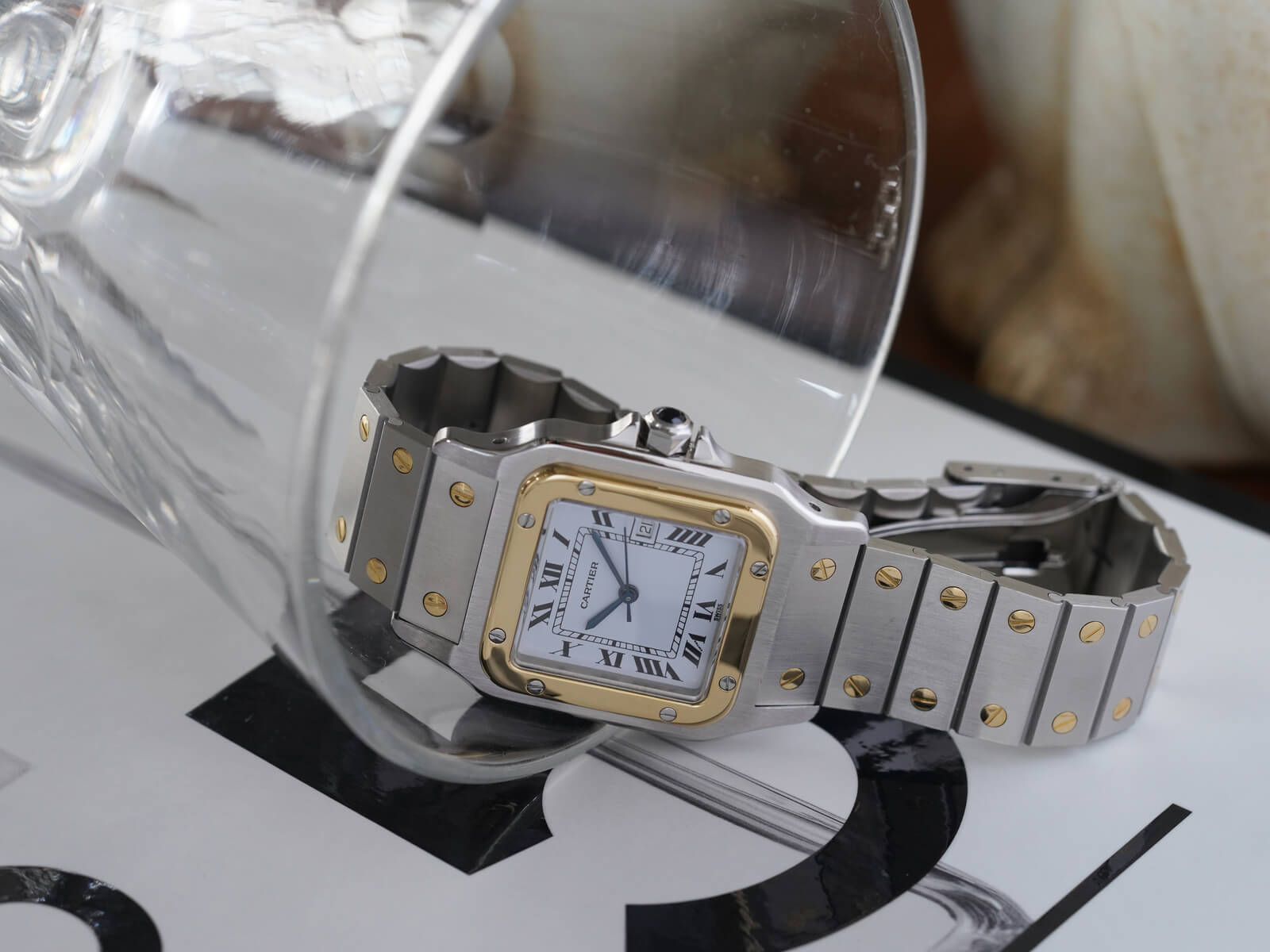 今回は、そんな歴史的背景のあるモデルの系譜である、サントスガルベLM・Ref.2961のご紹介です。それまでクラシカルな印象だったサントスに、スポーティーなテイストを調和させた魅力的なモデルです。カルティエ伝統のホワイトローマンダイヤルに、職人の手によって焼き入れされたブルースチールハンド、サファイヤカボションリューズ等が引き立つ美しいデザイン。シンプルでありながらも華やかさを感じさせる、伝統の宝飾技術を生かしたカルティエらしい一本です。