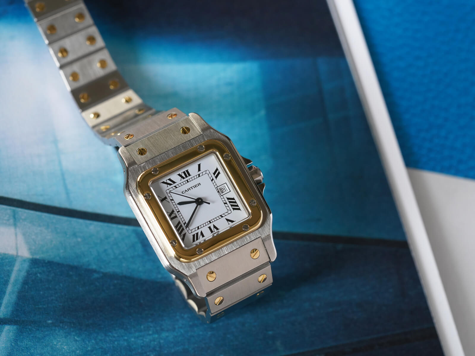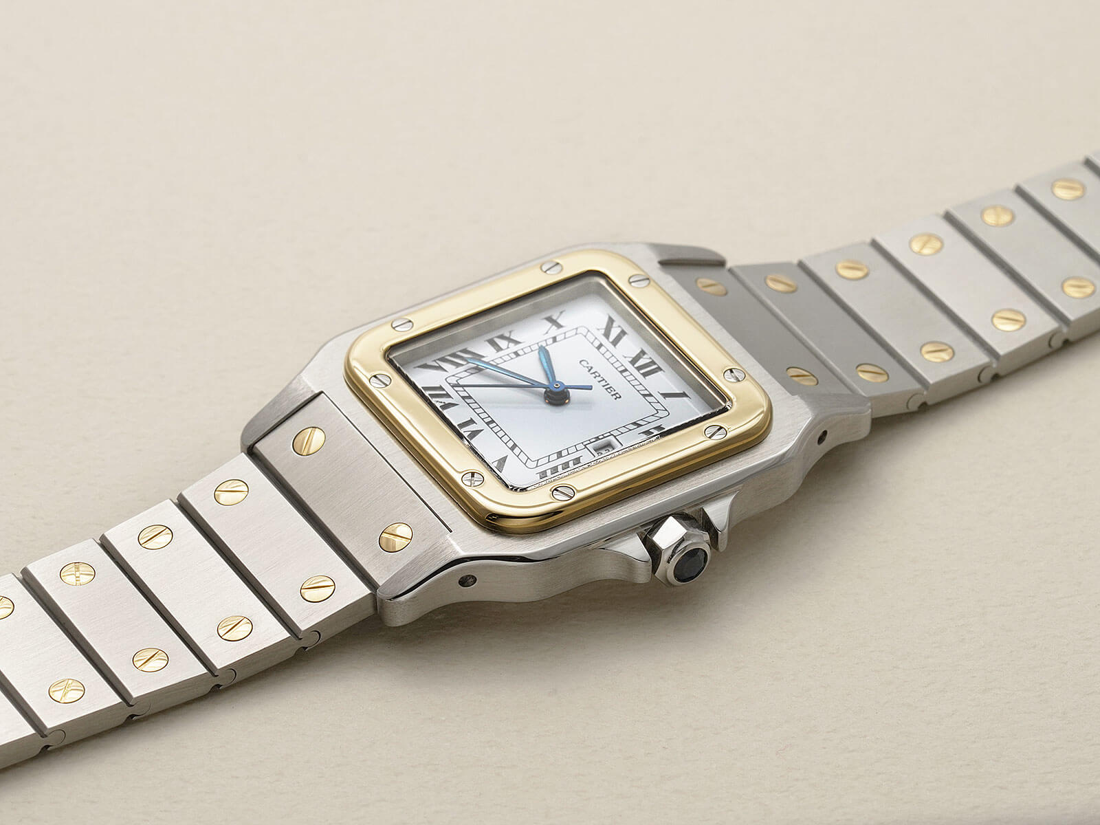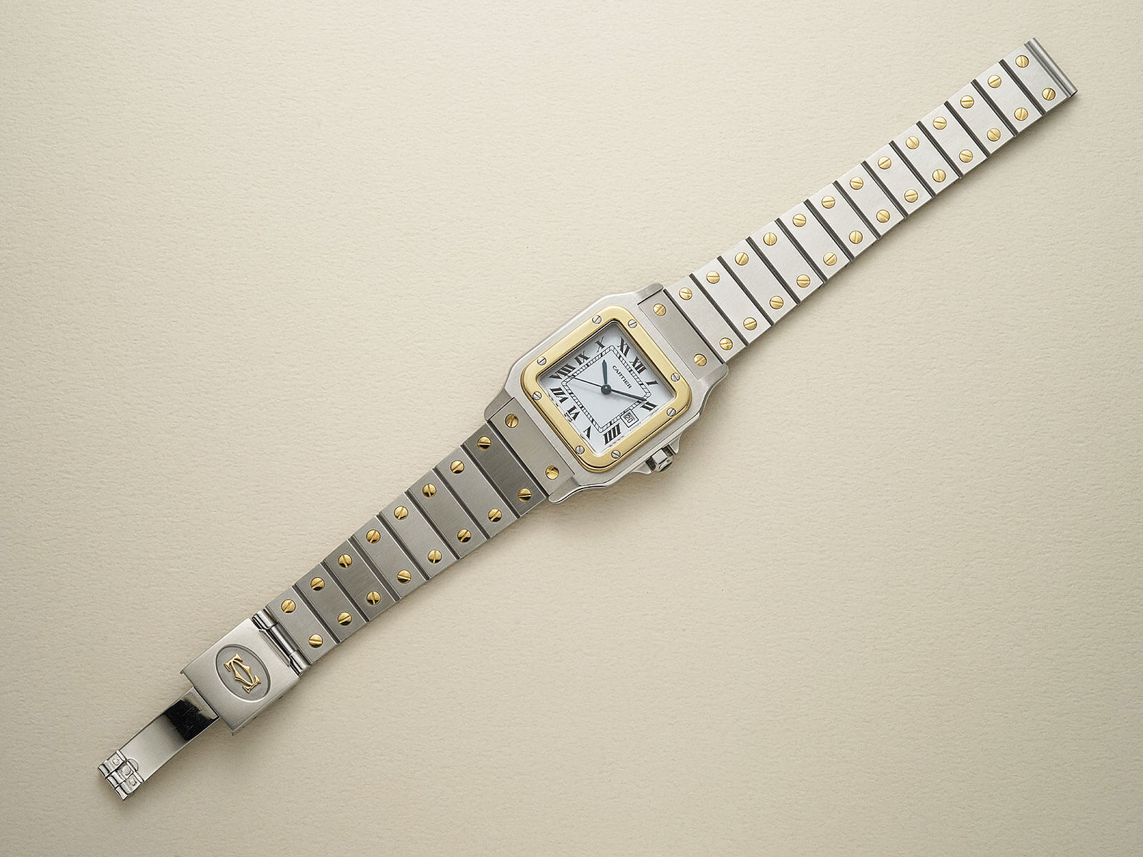 1904年、当時のファッションリーダーとして知られるブラジル人飛行家のアルベルト・サントス=デュモンが、三代目当主のルイ・ジョゼ・カルティエに「飛行機の操縦中に時間を見るのが困難だ」と相談したことがきっかけで製作された「サントス」。懐中時計のように取り出す必要がないという実用性の高さが画期的で、世界初の腕時計となりました。