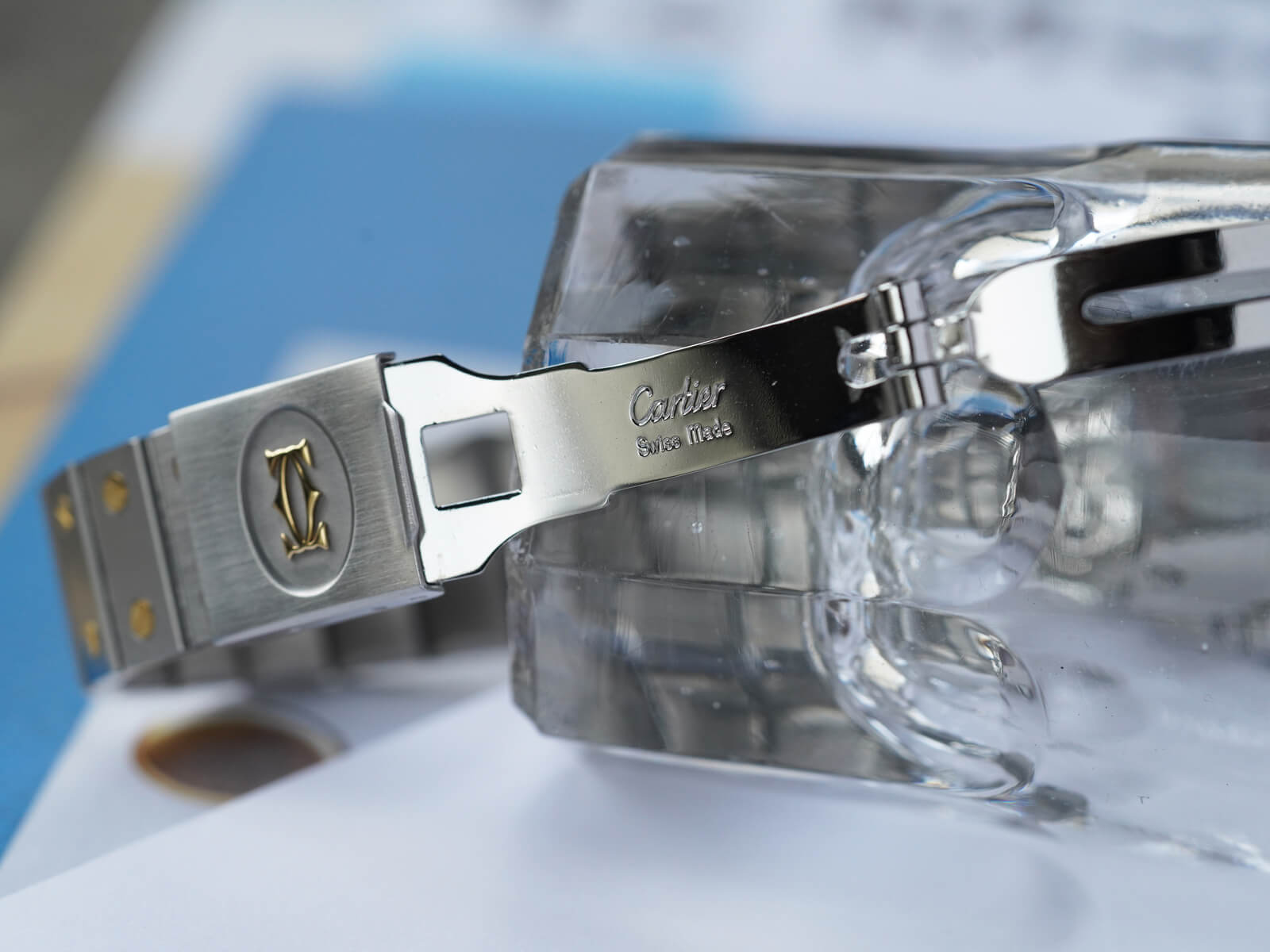 ブレスレットには、通称「ラブブレスレット/Love Bracelet」に、貴重なカルティエロゴ入リ初期型シングルバックルをセッティング。近代的なラグジュアリースポーツの様な装いで、デイリーからフォーマルまで幅広く使える素敵な時計です。是非、店頭にてご覧ください。内部チェックは済んでおりますが、機械精度が良いためオーバーホールは行っておりません。ご希望のお客様にはオーバーホール後のお渡しも可能です(無料施工)。