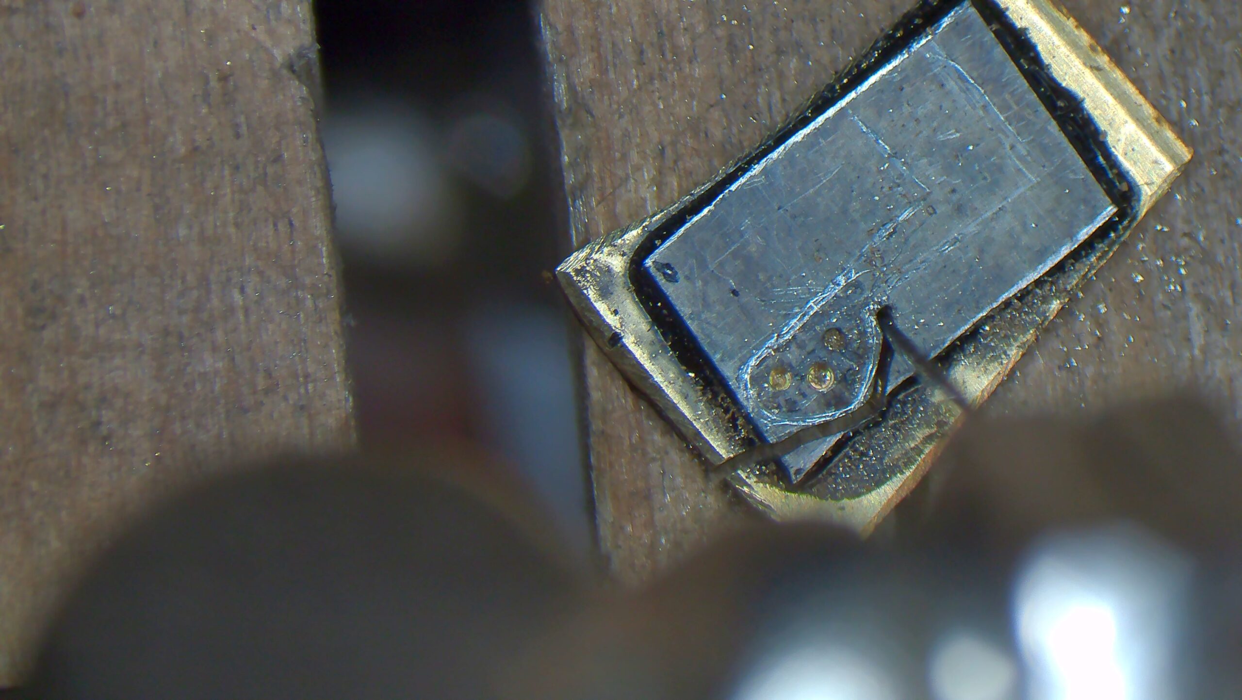顕微鏡の画像です。受けの角は勿論の事、ルビーが入る穴の周りやアンクルと呼ばれる小さいパーツにも仕上げが施されています。コート・ド・ジュネーブも綺麗です。