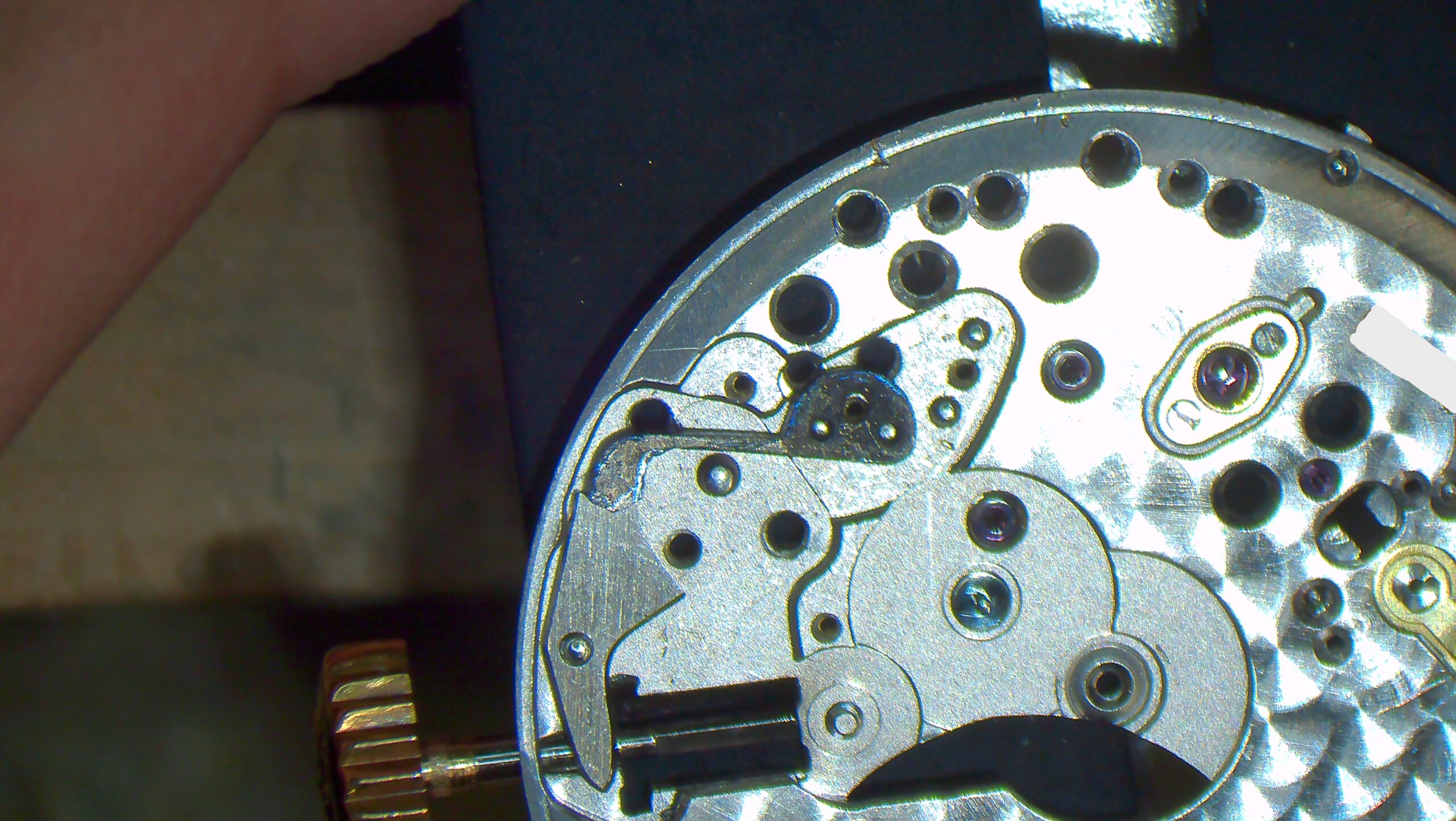 本来は赤い丸で囲った部分にバネパーツが2種類入りますが、案の定パーツが破損・紛失してました、、、、こちらは違うバネを入れてありますね。よく破損しやすい箇所なので仕方ない気持ちもありますが、このままではダメなので後ほど製作します。このままでも使えない事はないのですが、リューズを引いた操作の際にすぐに元の位置に戻ってしまいます。パテックフィリップに限らずお持ちの時計で同じ様な症状がある場合は一度ご相談下さい。