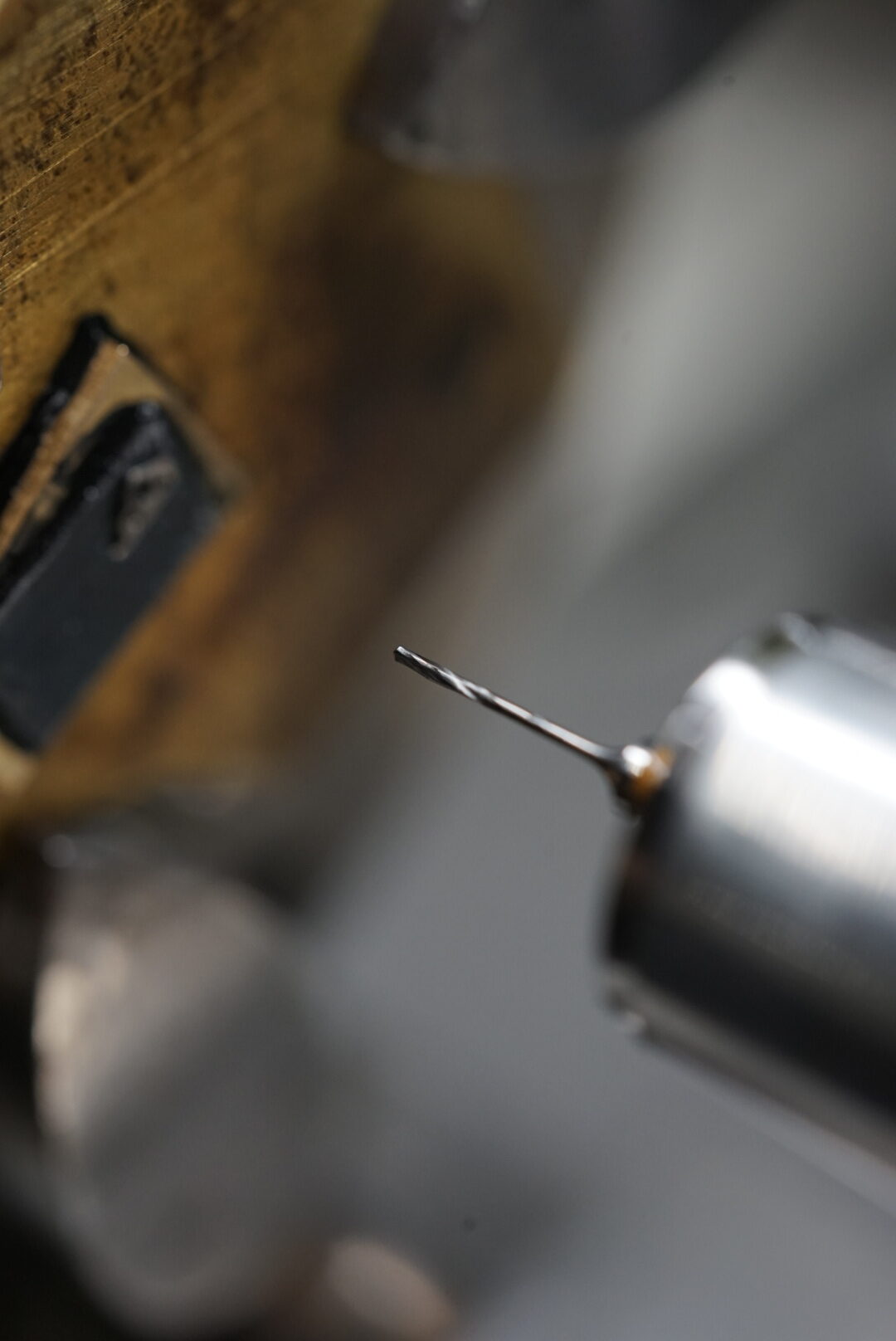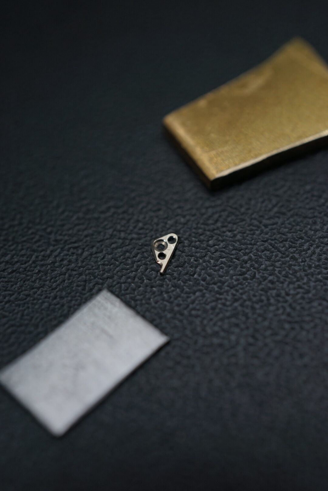 鉄の板から製作します。まずは使う分だけ切り落とし、残っていたパーツをもとにピンの入る穴・ネジの入る穴を開けていきます。
