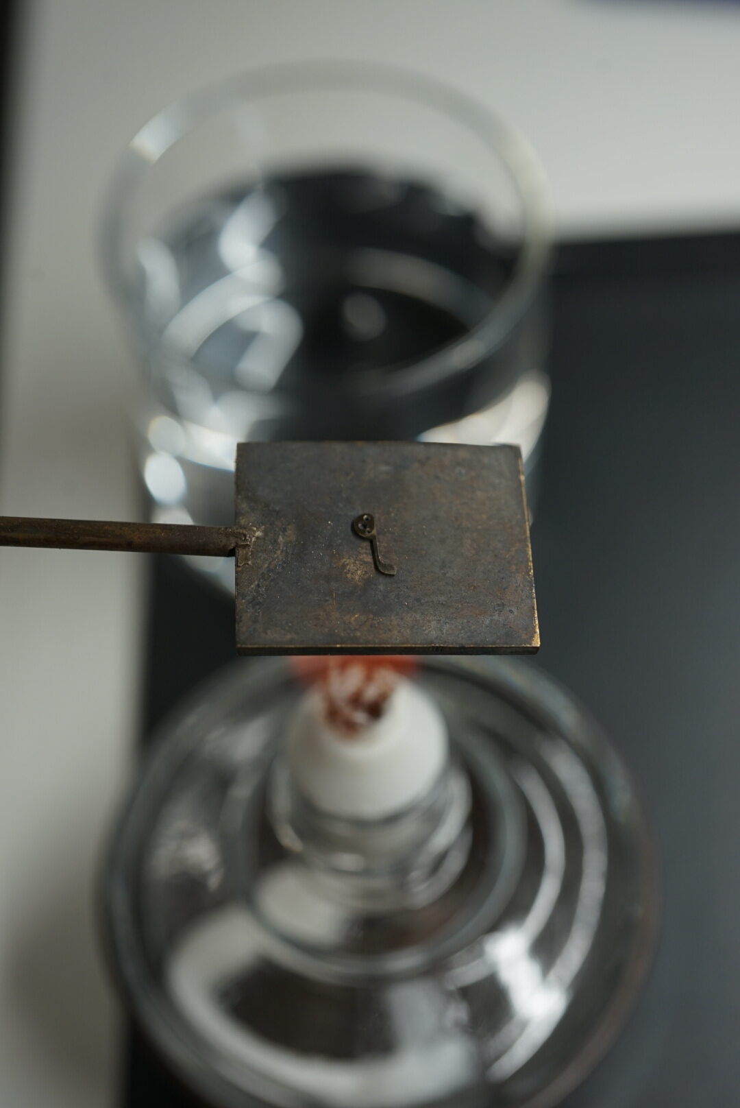 形を整えた後、パーツに適度な強度を持たせるために、焼き入れと焼き戻しを行います。まずは焼き入れです。赤くなるまで火で熱して水に入れると素材が硬くなります。