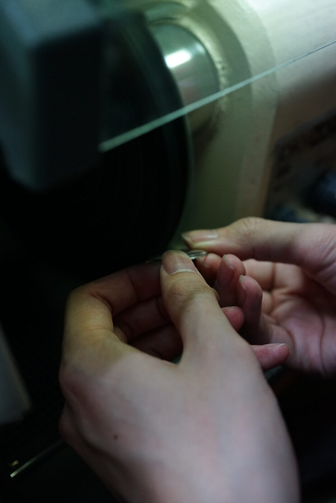 元々のパーツは角も面取りされていて、側面もヘアラインが入っているので同じように仕上げます。小さいパーツで保持がしづらいので、治具も製作してます。