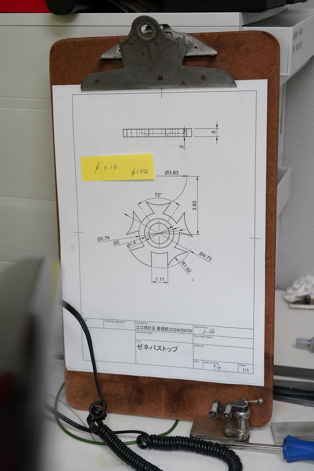 まずは設計図を作成しました。ネジなどはあまり複雑な形状ではないので、手書きで大体の寸法を書いて製作しますがゼネバストップは形状が複雑な為、正確な寸法が必要でした。