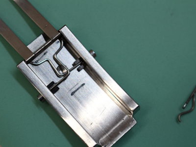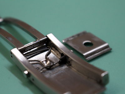 通常ホールドの良いオメガのクラスプ。お客様からのご依頼は、内バネが折れた事により、ホールドしなくなってしまった金具を直したいとの事。