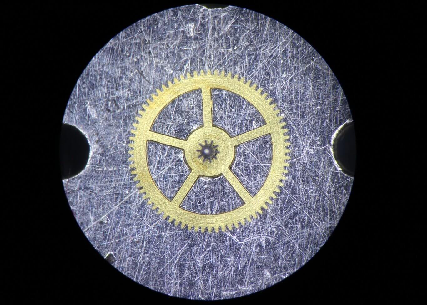 薄型のムーブメントの為、1番受けの下に丸穴車・角穴車が配置されています。
