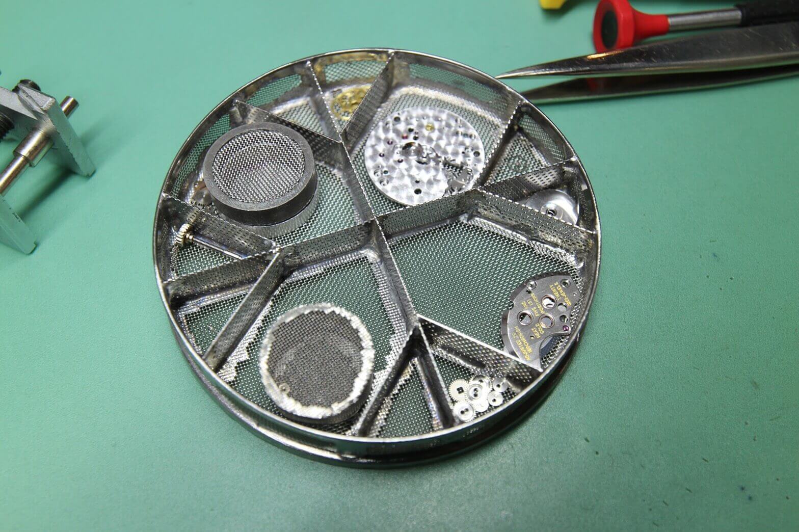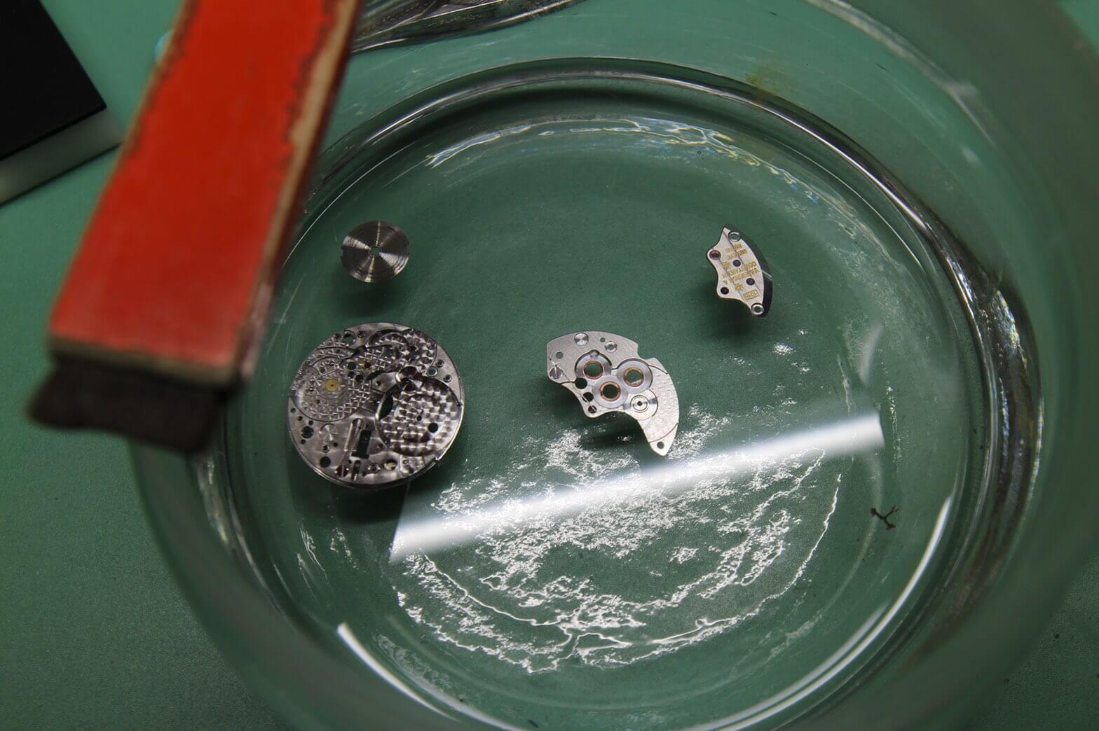 初期状態の精度を確認後ケースからムーブメントを取り出し、針・文字盤を取り外し不具合がないか確認しながら分解していきます。