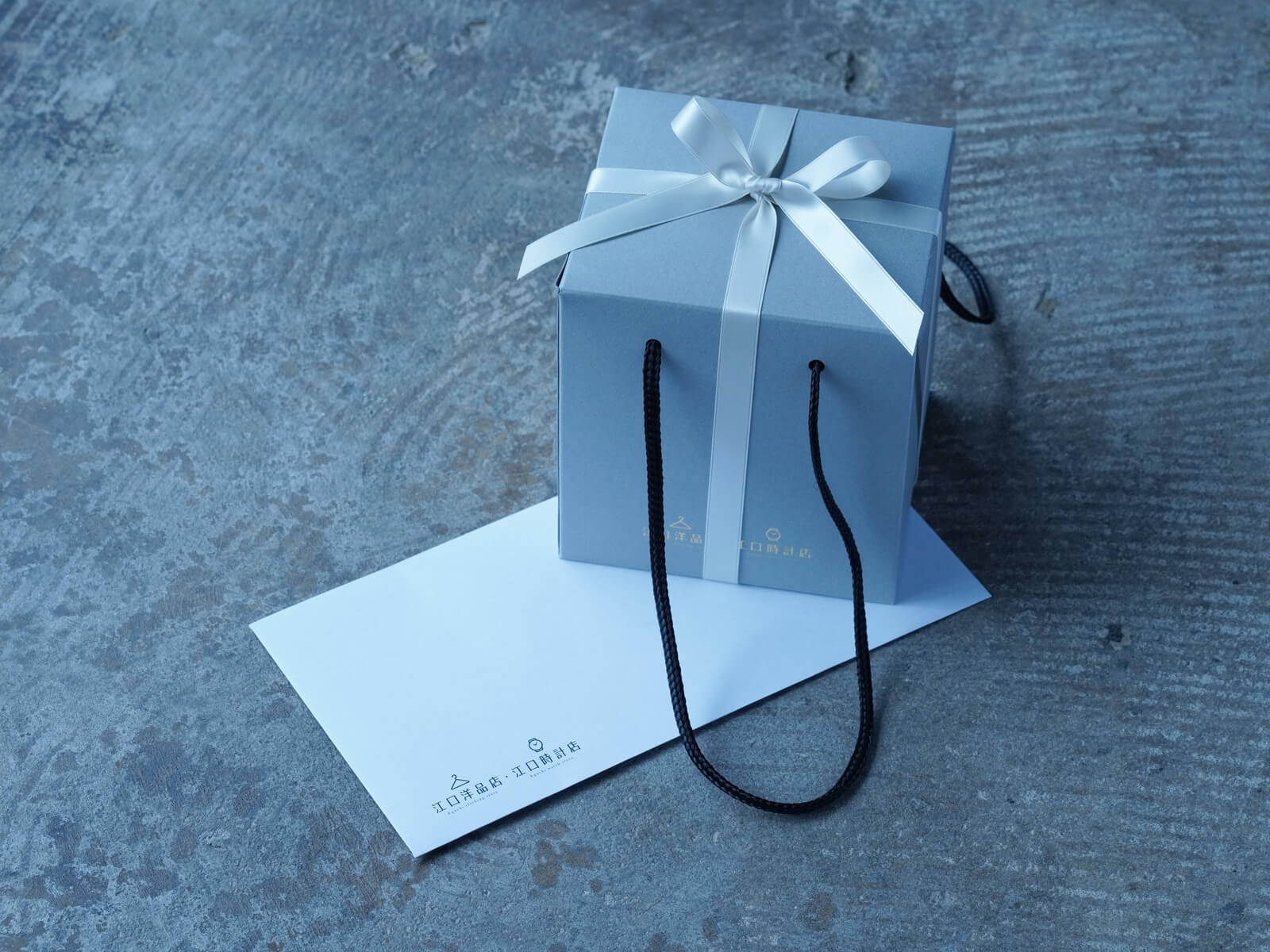 構造上の拘りは、箱の側面に折り目を入れて形を作り、リボンをかける事によって、特別なお買い物をしたという事をお客様に感じて頂けたら、これほど嬉しい事はありません。
