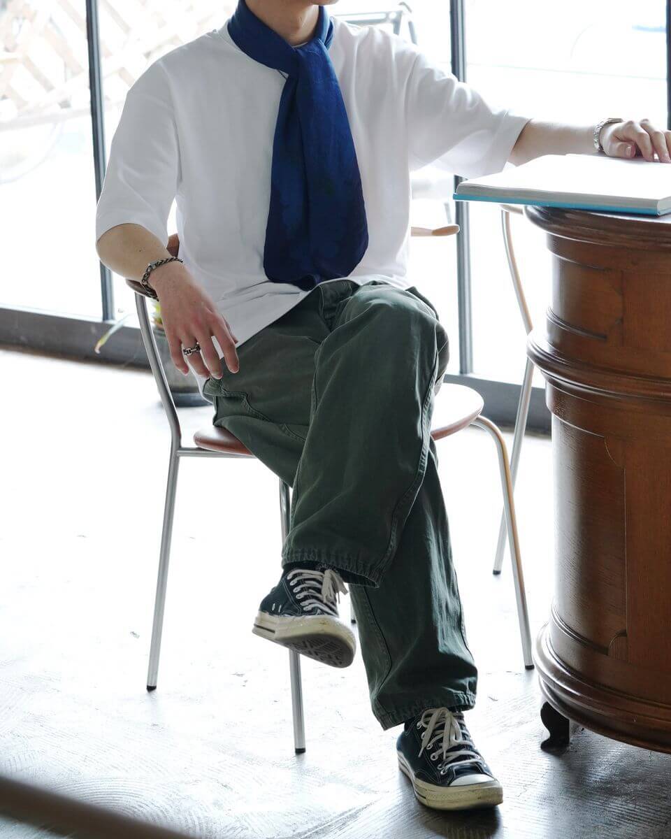 シンプルに白Tシャツに合わせたコーディネートですが、H.DYED CARREもクロシェットネックレスもとても映えるんです。
